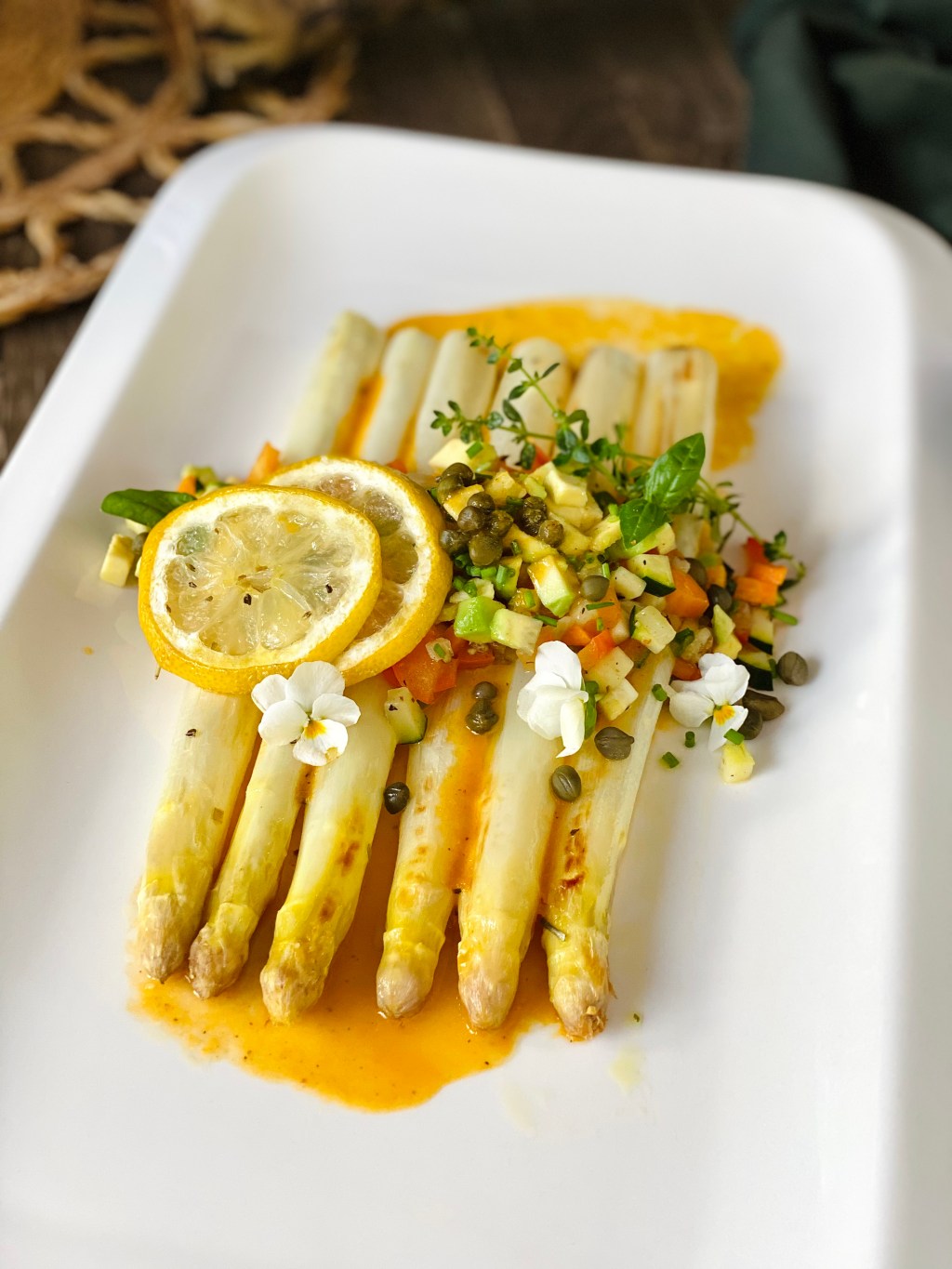 Den Spargel mit Soße, Gemüse, Avocado und Kapern auf Tellern anrichten.