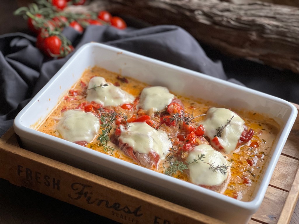 Die Tomatensahne über die Filets gießen. Den in Scheiben geschnittenen Mozzarella und ein paar Thymianzweige darauf legen.