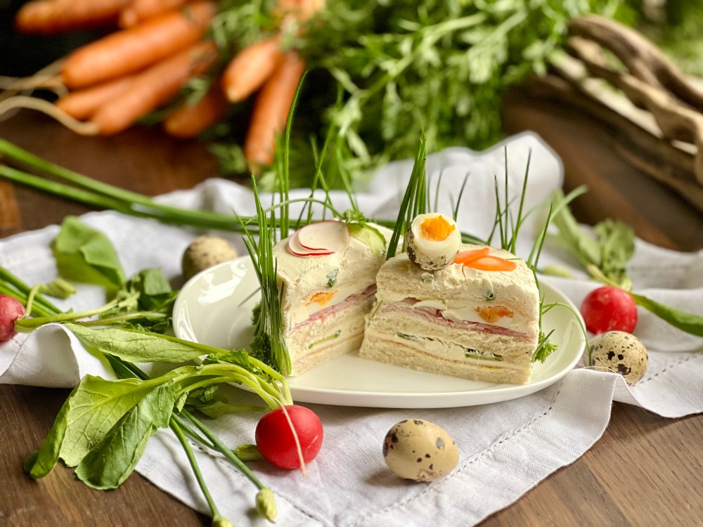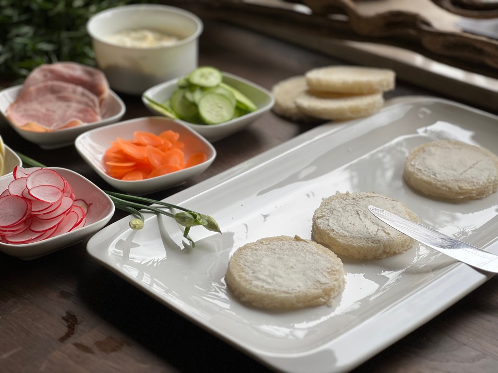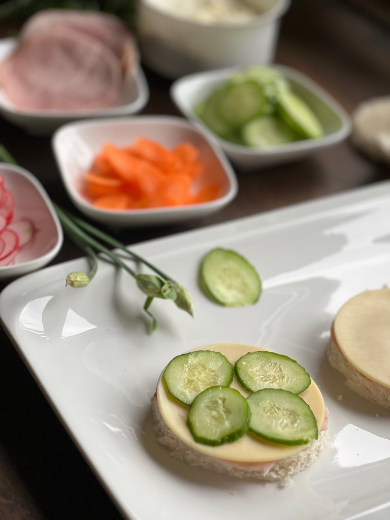 Abwechselnd Minigurken, danach wieder eine Scheibe Toast mit Meerrettichfrischkäse, etwas Senf, Schinken, gekochtes Ei in Scheibengeschnitten und Radieschenscheiben.