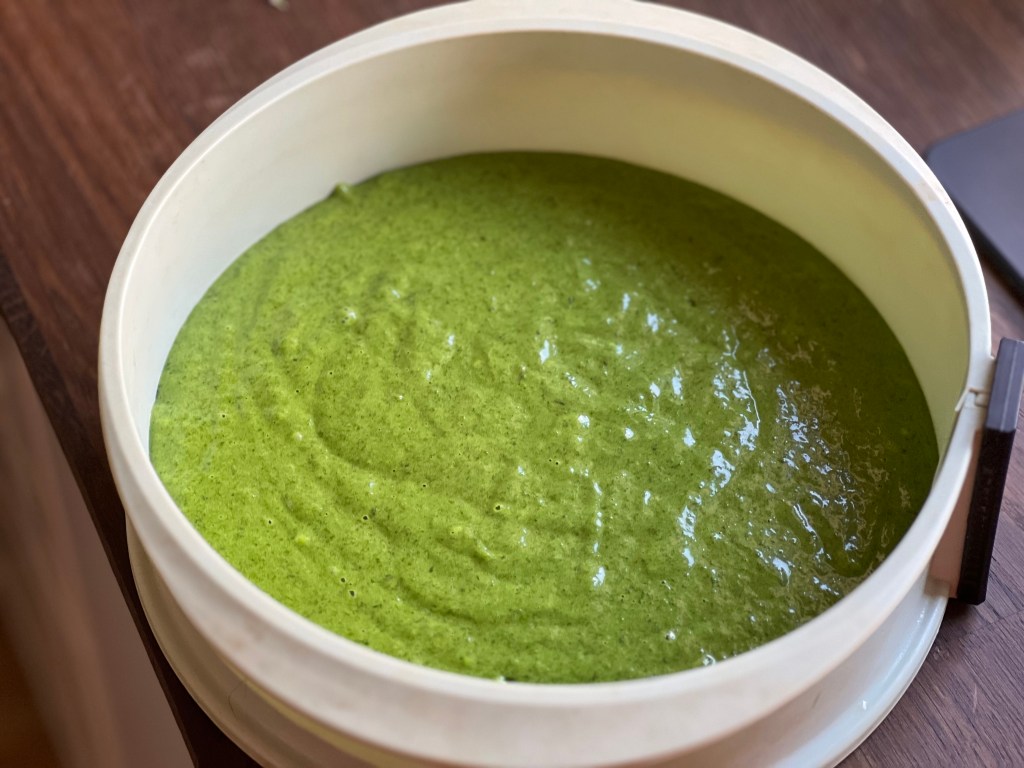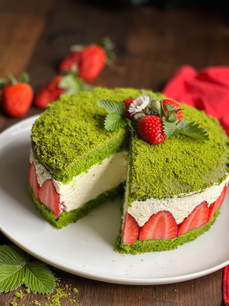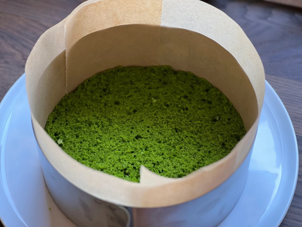 Für den Spinatbiskuitboden den Spinat mit dem Pürierstab pürieren. Den Zucker und die Eier schaumig rühren. Das Sonnenblumenöl langsam in die schaumige Masse rühren. Den Spinat unter die Eimasse heben. Das Mehl mit dem Backpulver mischen, sieben und kurz unter die Eimasse heben. Die Biskuitmasse in die vorbereitete Backform füllen und im Backofen ca. 35 Minuten backen. Backofen während dem backen nicht öffnen.