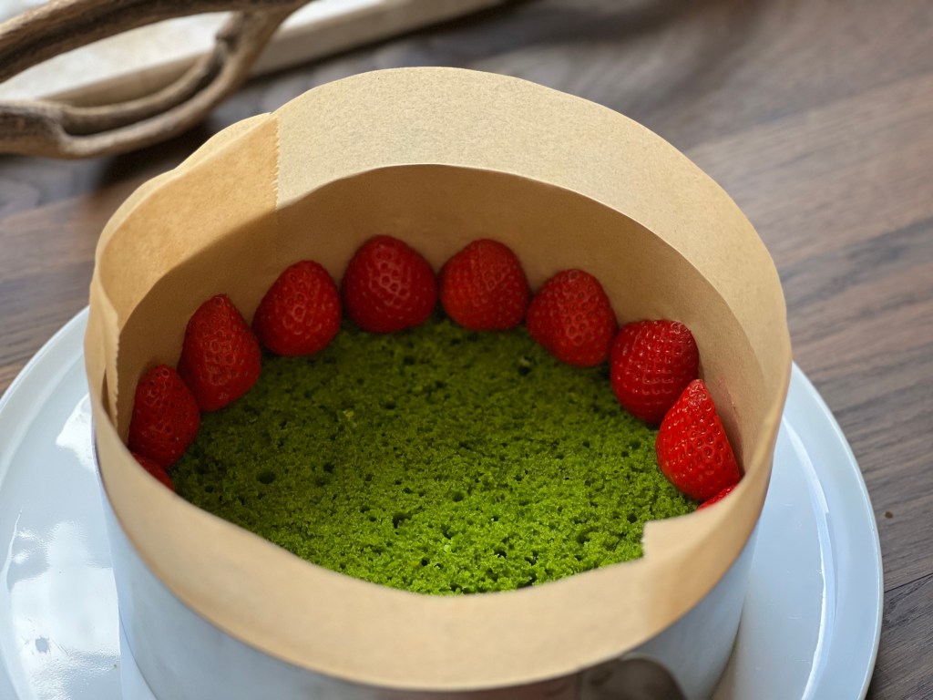Halbierte entstielte Erdbeeren an das Backpapier am Tortenring mit der Schnittfläche andrücken.
