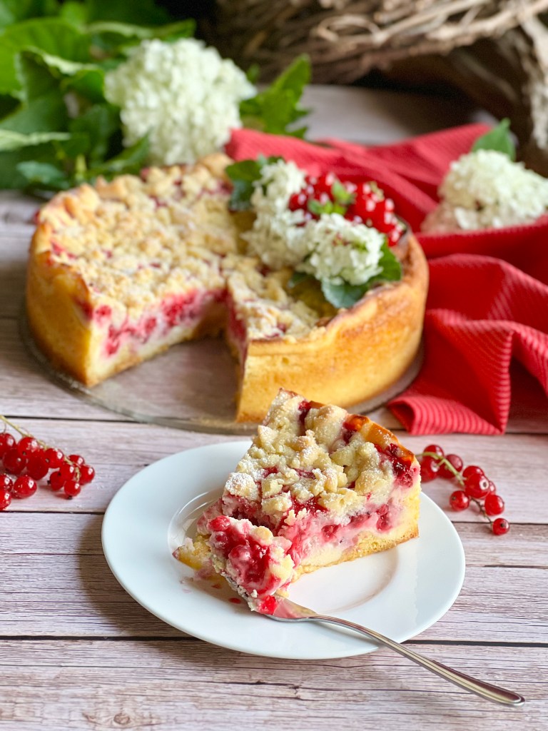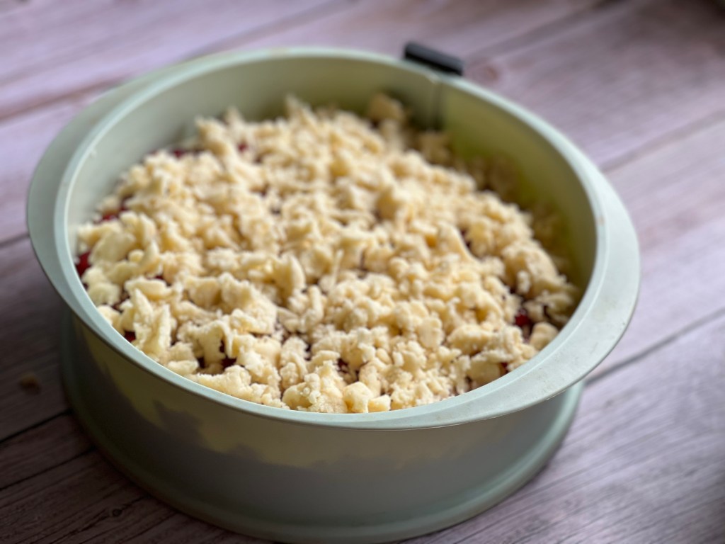Alle Zutaten für die Streusel verkneten und auf den Johannisbeeren verteilen.