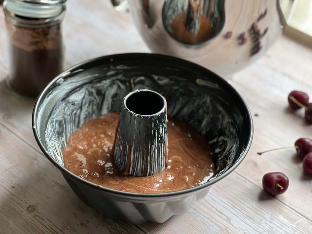 Eier, Zucker und Vanillezucker 10 Min. schaumig schlagen, Mehl, Kakao und Backpulver sieben und vorsichtig unterheben.