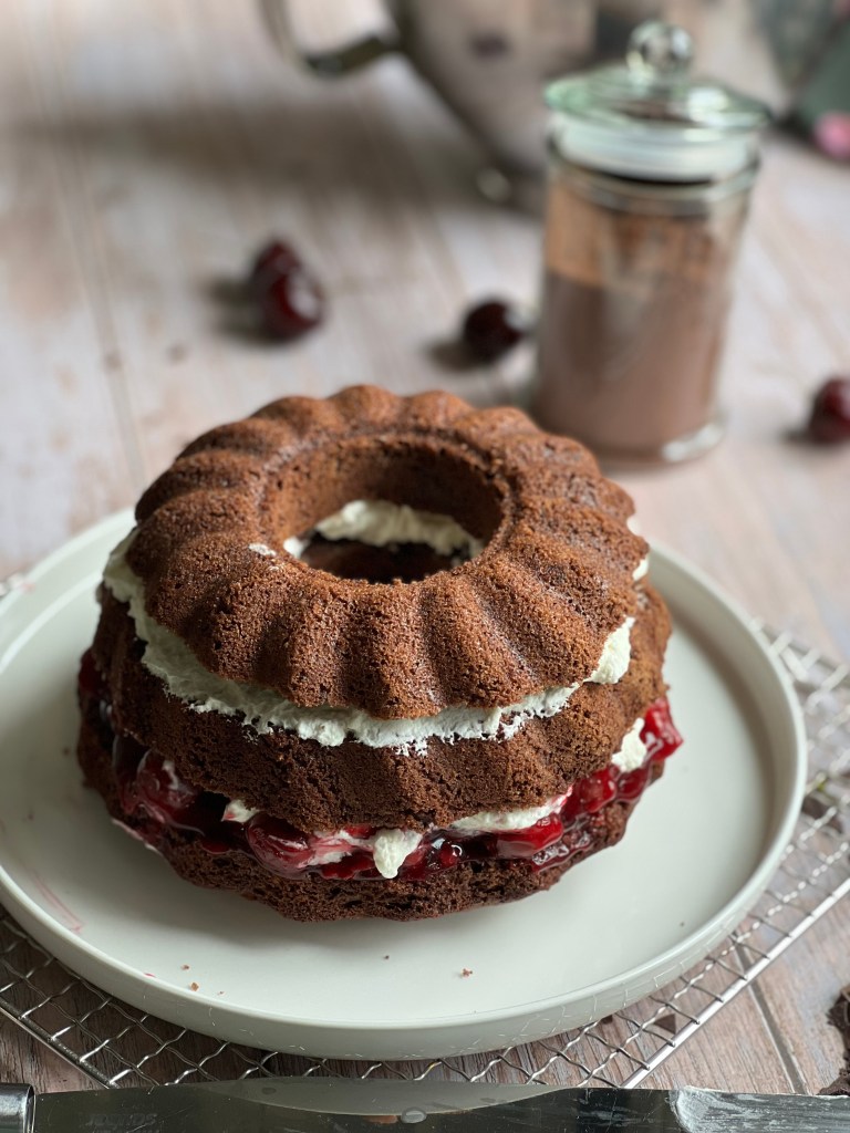Wieder mit 3 TL Kirschwasser beträufeln und mit Sahne bedecken. Oberen Boden daraufsetzen.