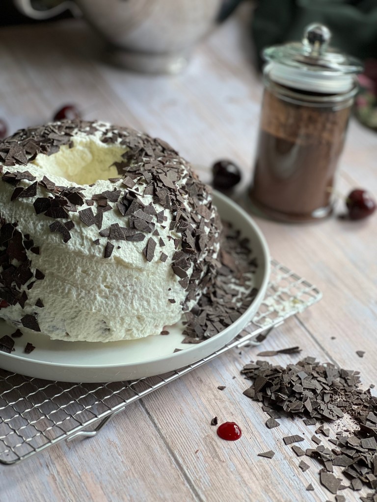 Schokoraspel auf dem Kranz verteilen, leicht andrücken. Sahnetuffs daraufsetzen und mit Kirschen garnieren.