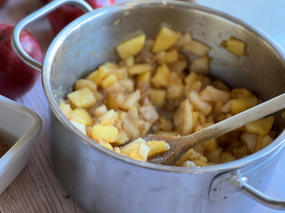 Äpfel schälen, vierteln, Kerngehäuse entfernen und würfeln. Mit Zucker, Weißwein, Zitronensaft und Zimt in einem Topf zum Kochen bringen und circa 10 Minuten unter Rühren köcheln, danach abkühlen lassen.