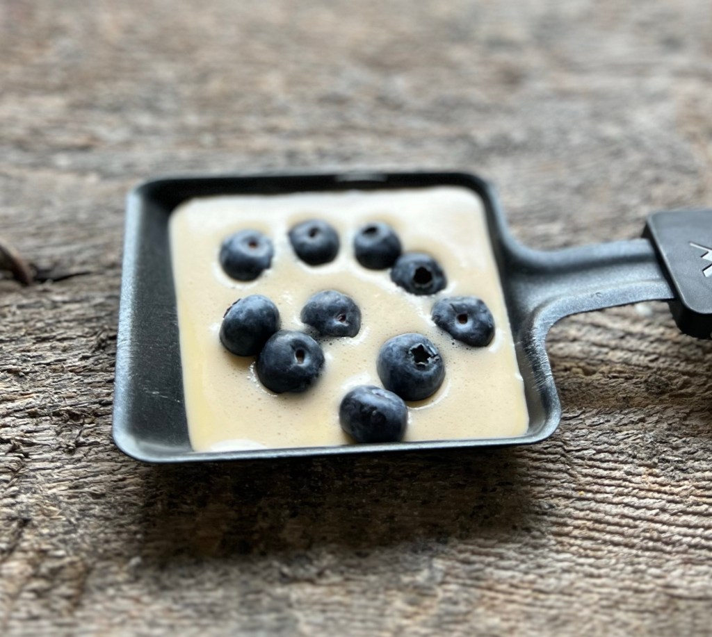Etwas Butter im Pfännchen schmelzen und Pfannkuchenteig hineingeben.