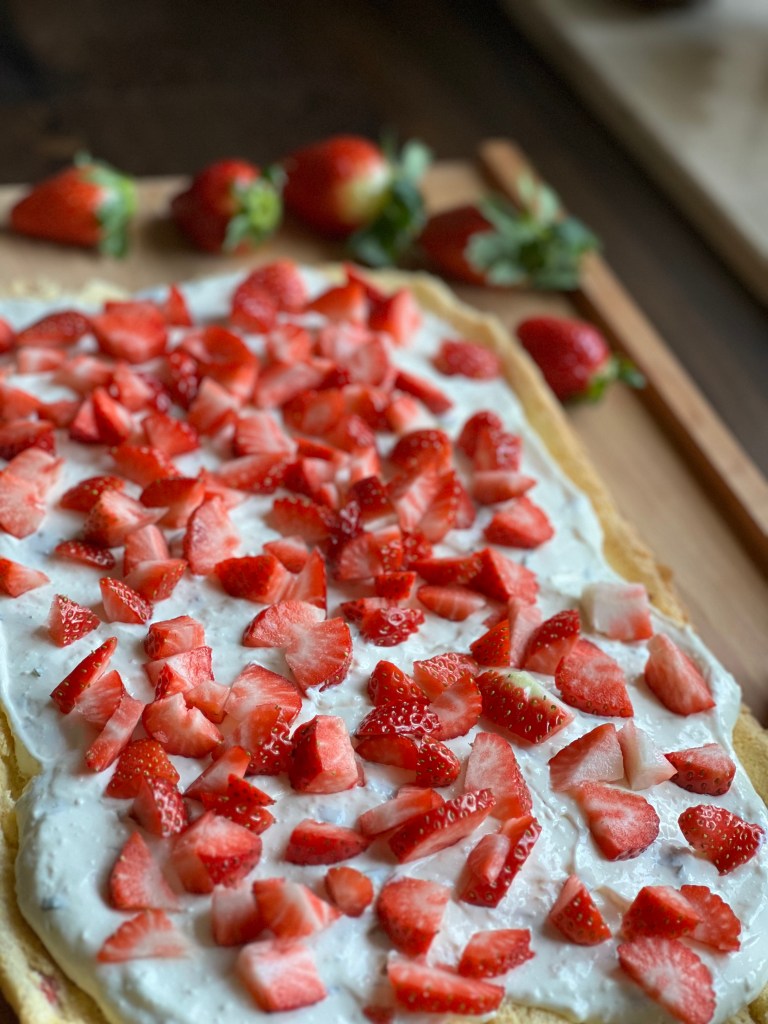 Ein Blech mit Backpapier belegen. 2 Drittel der Teig Masse auf dem Blech glatt streichen. Den Rest des Teiges rot einfärben und mit Hilfe eines Löffels streifig auf der Masse verteilen.