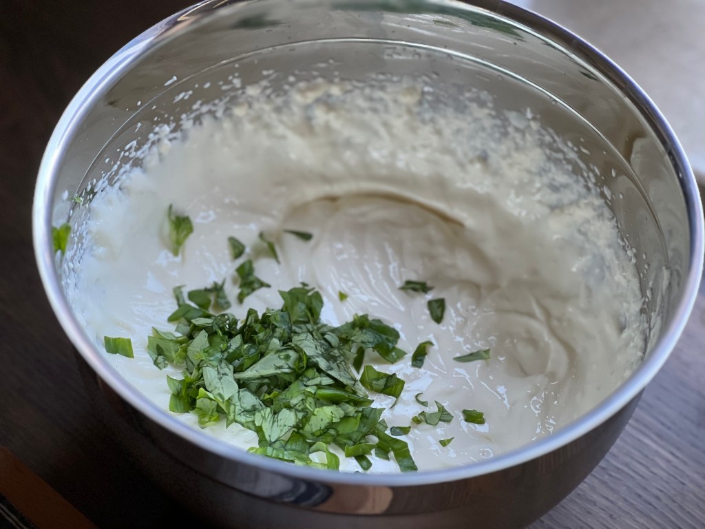 Basilikum fein hacken.