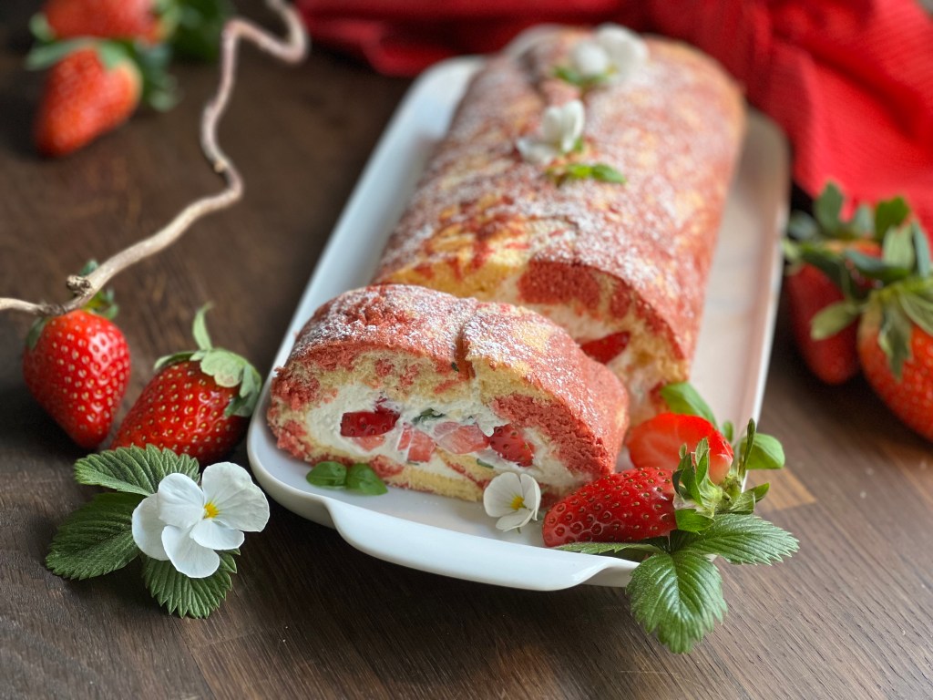 Den Biskuit aufrollen, mit der Creme bestreichen, die Erdbeeren darauf verteilen und das ganze einrollen. Eine Stunde kalt stellen. Mit Puderzucker, Basilikum, Erdbeeren garnieren.