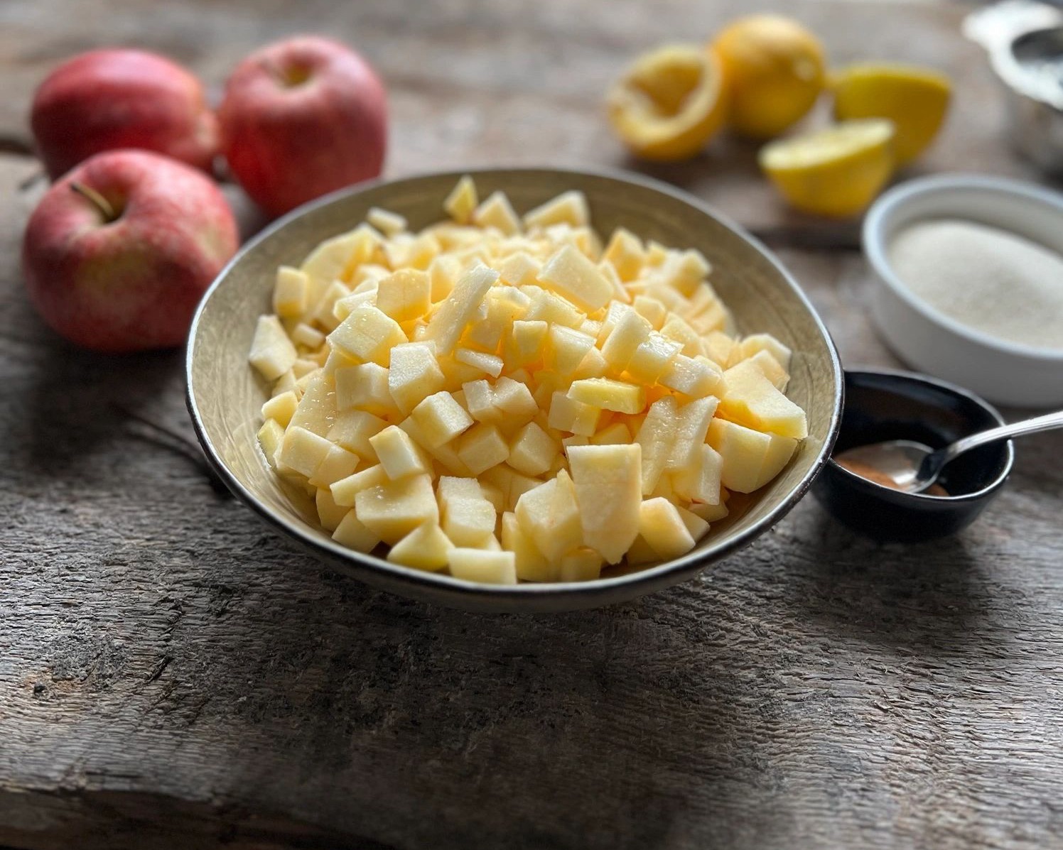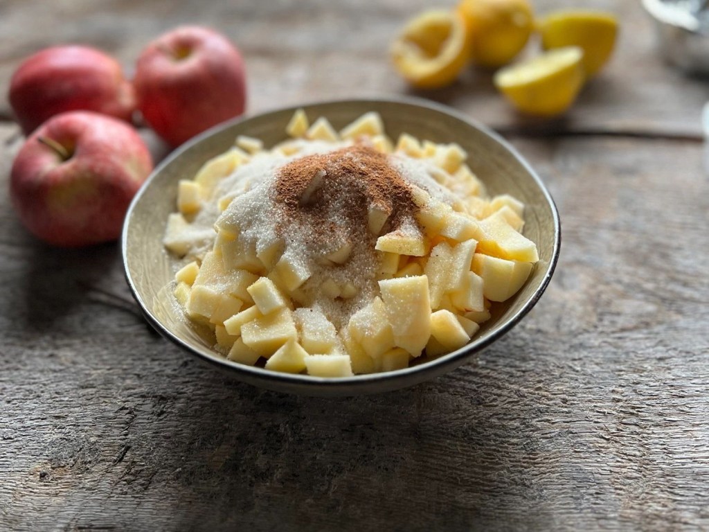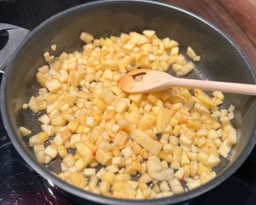 Die Äpfel mit Zitronensaft, Zucker und Zimt vermengen, in einer Pfanne ca. 5 Minuten andünsten und beiseitestellen.