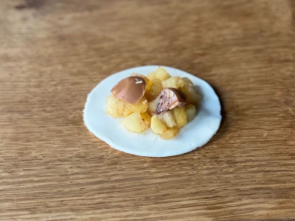 Die Karamellbonbons fein hacken. Blätterteig ausrollen und Kreise ausstechen. Die Kreise mittig mit je 2 EL Apfelmischung und 1 EL Karamellbonbons belegen.