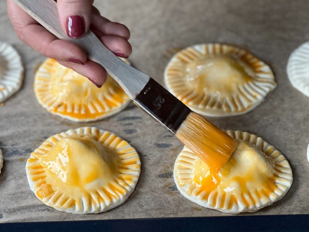Ränder mit einer Gabel andrücken. Apfeltaschen auf ein mit Backpapier belegtes Blech setzen, mit der Eigelbmischung bepinseln und ca. 25 Minuten bei 200 Grad Ober-Unterhitze backen.