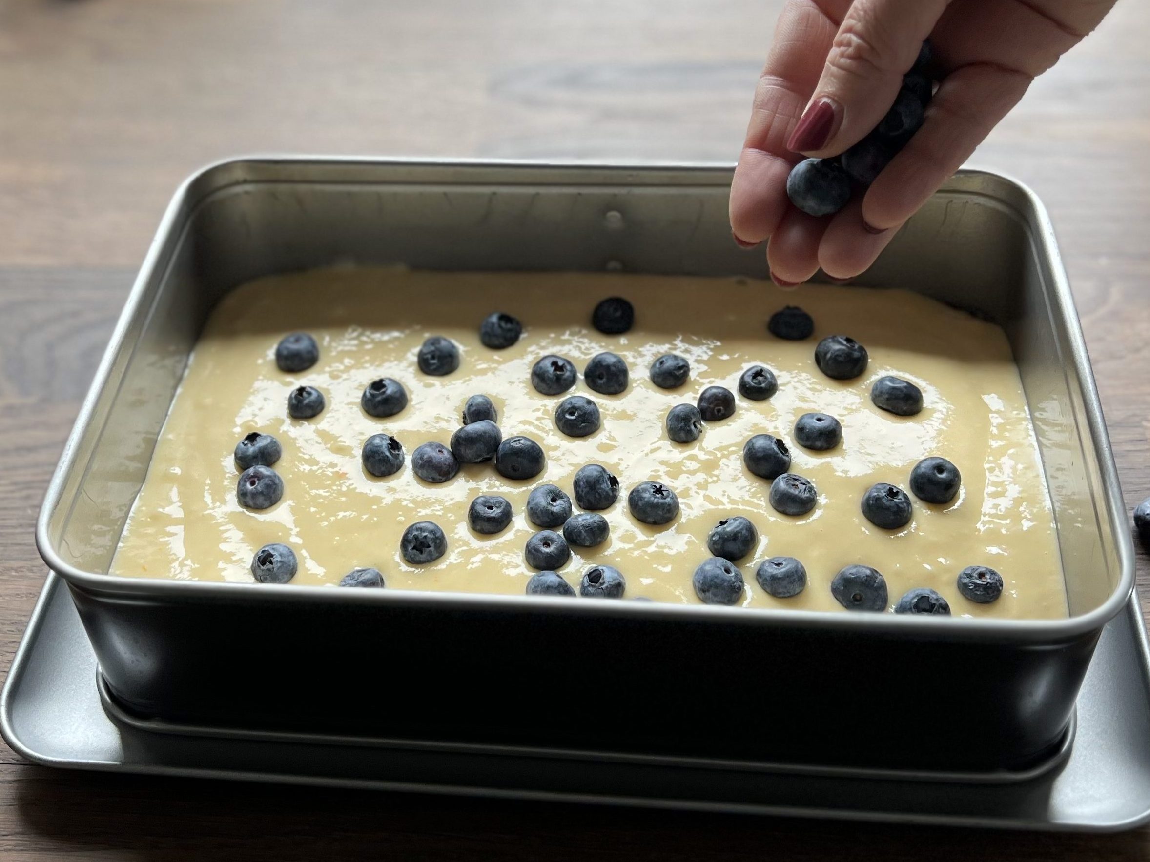 Die gewaschenen Blaubeeren darauf verteilen.