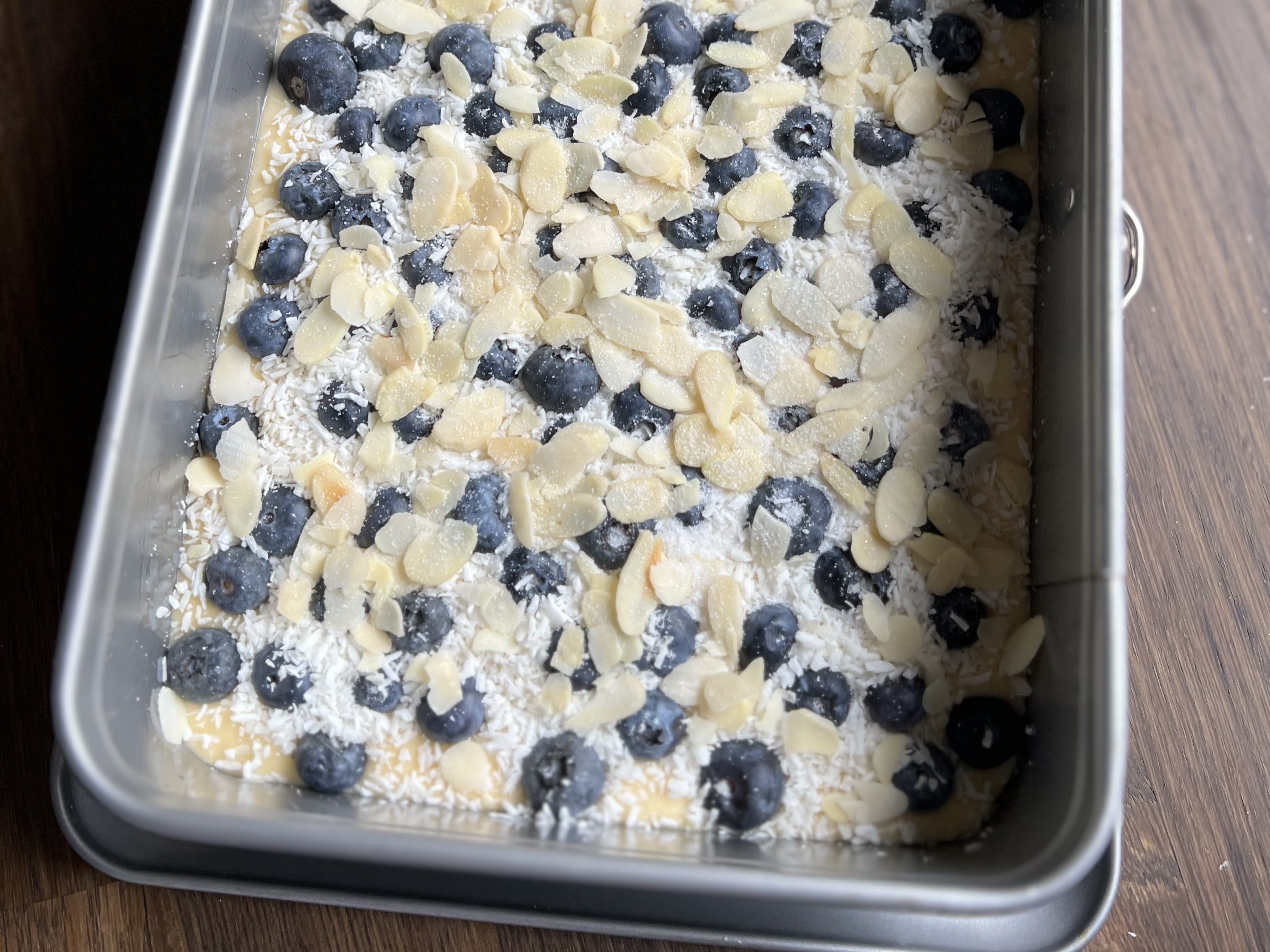 Kokosraspel und Mandelblättchen darauf verteilen und restlichen Zucker daraufstreuen.