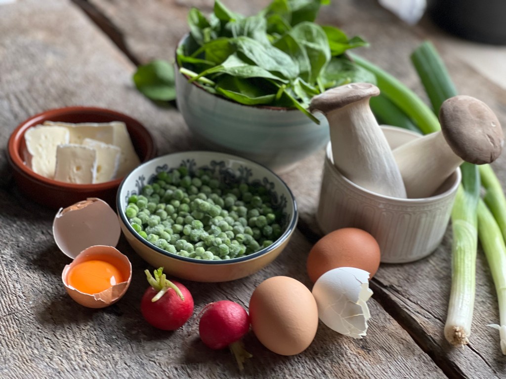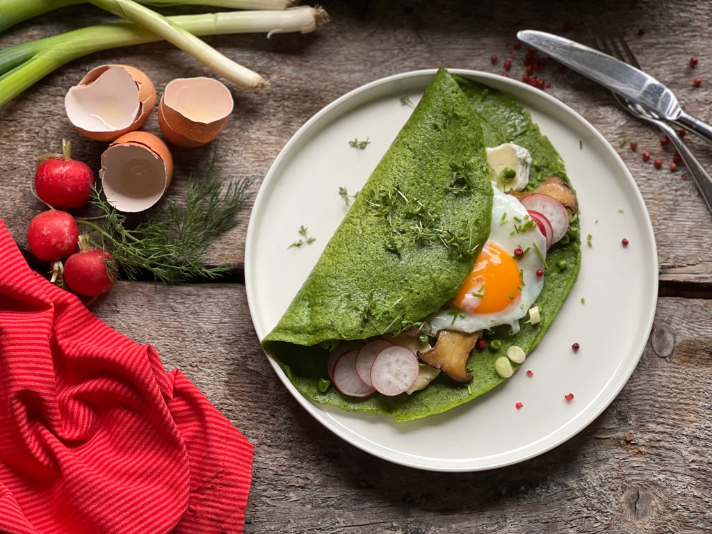 In der Zwischenzeit in einer weiteren Pfanne die Spiegeleier braten. Omelette auf einen Teller geben und mit Erbsen, Frühlingszwiebeln, Kräuterseitlingen, 2-3 Scheiben Camembert und Spiegelei füllen. Radieschen darauf geben, mit Kräutern bestreuen und servieren.
