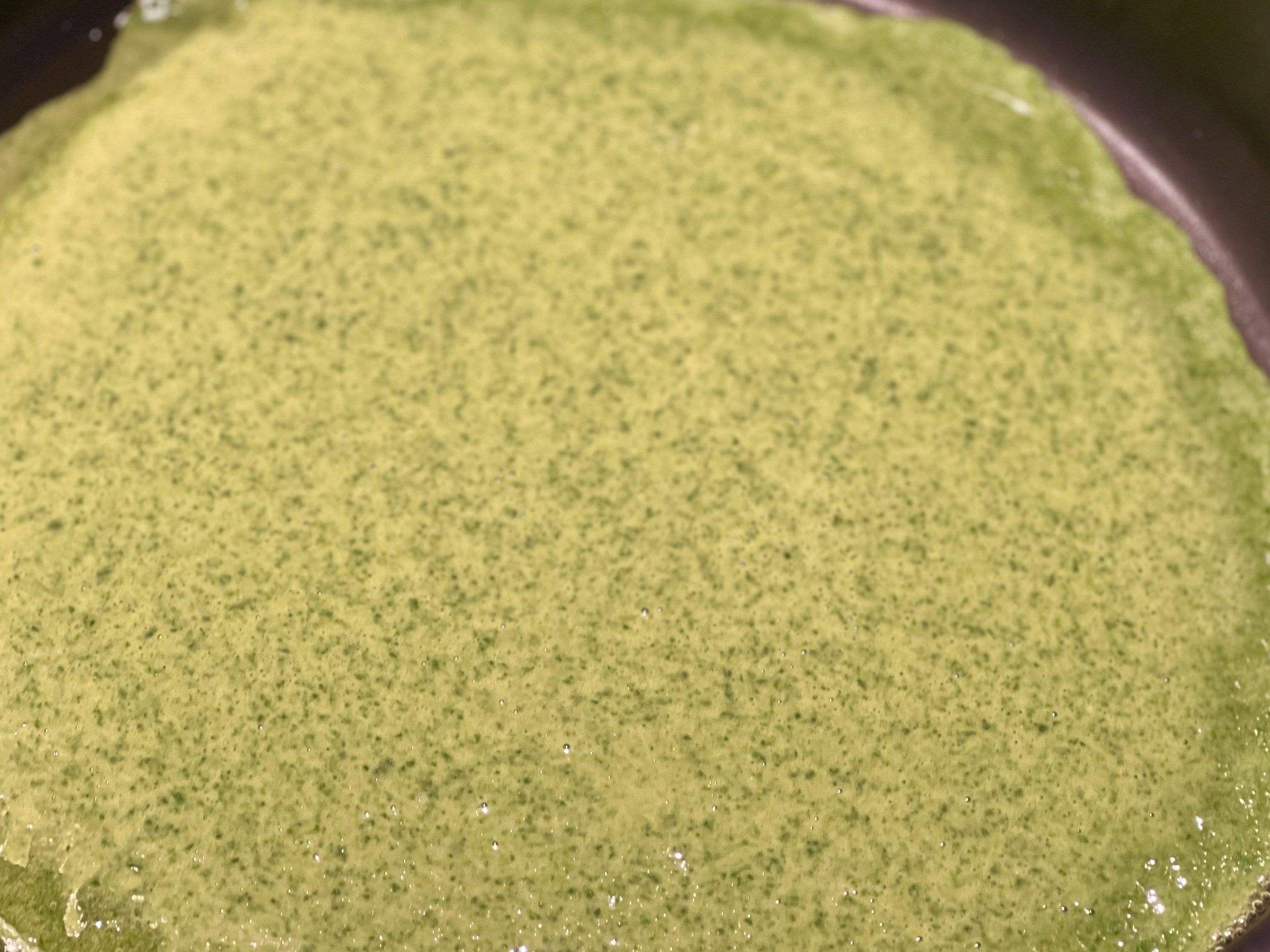 Babyspinat waschen, in einer Pfanne bei geringer Hitze zusammenfallen lassen, etwas abkühlen lassen und fein pürieren. Milch, Eier, Mehl und eine Prise Salz zu einem feinen Teig verrühren. Spinat dazugeben und verrühren.