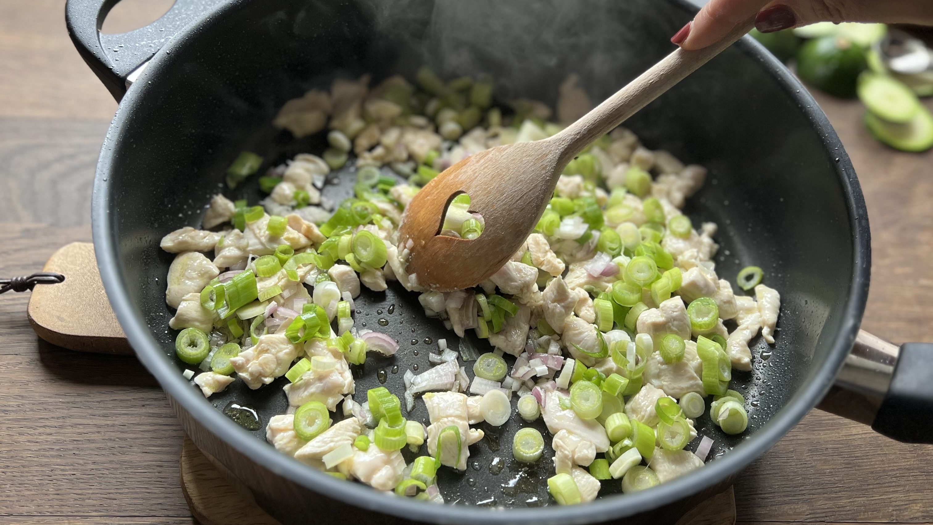 Zwiebel, Lauchzwiebeln dazugeben und kurz mitbraten.