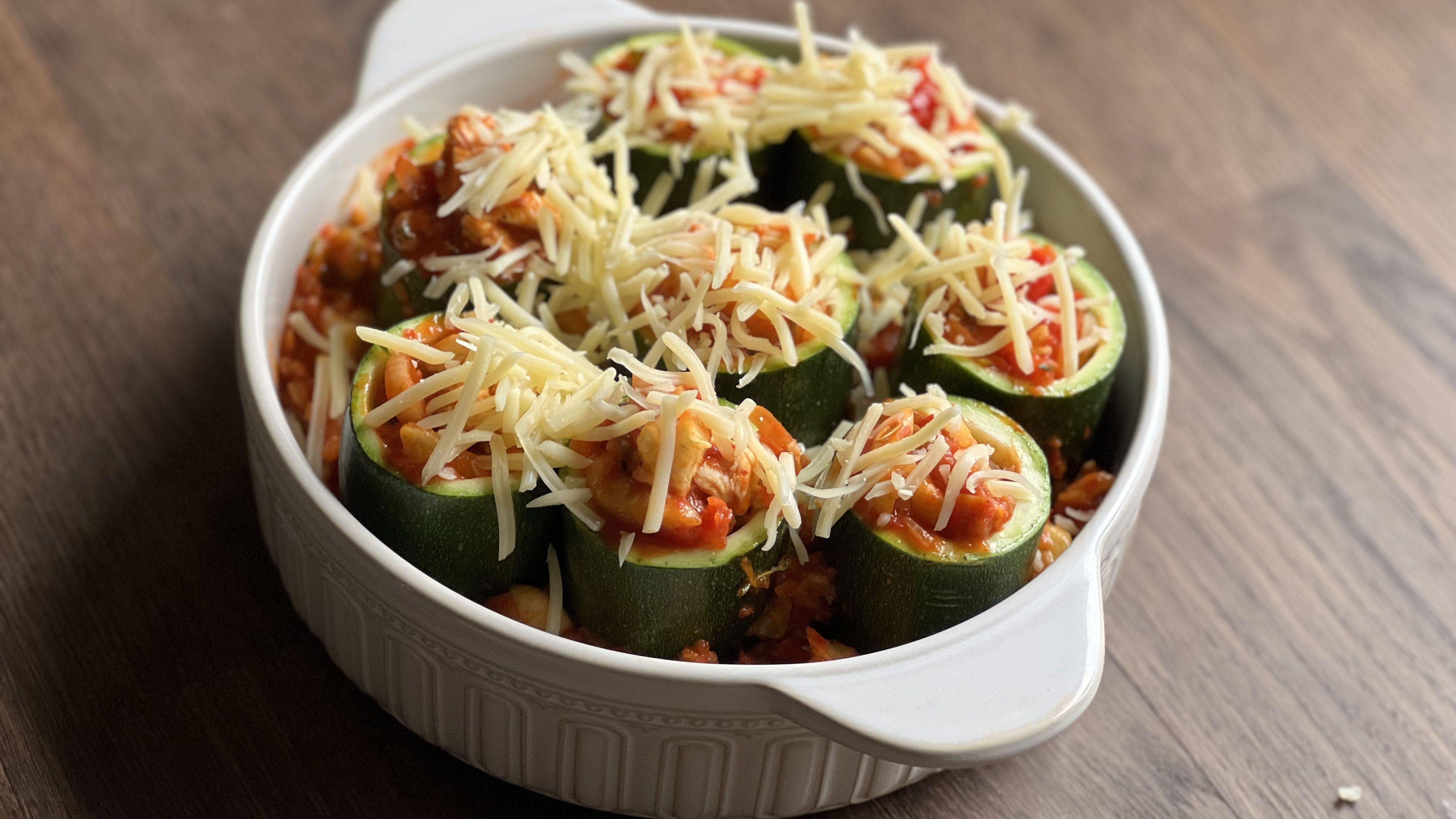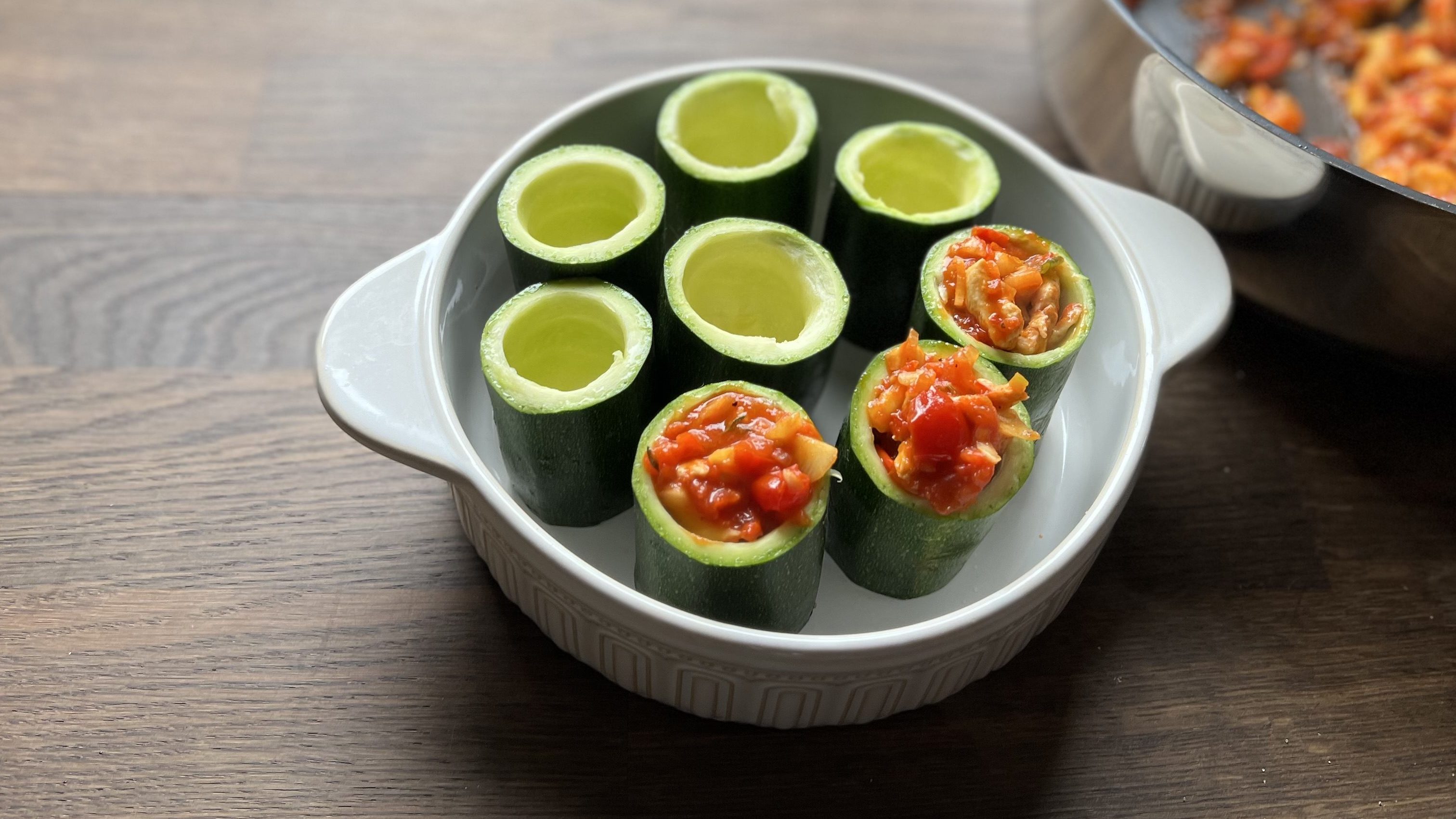 Sugo in die Zucchini füllen. Den Rest in die Zwischenräume füllen.
