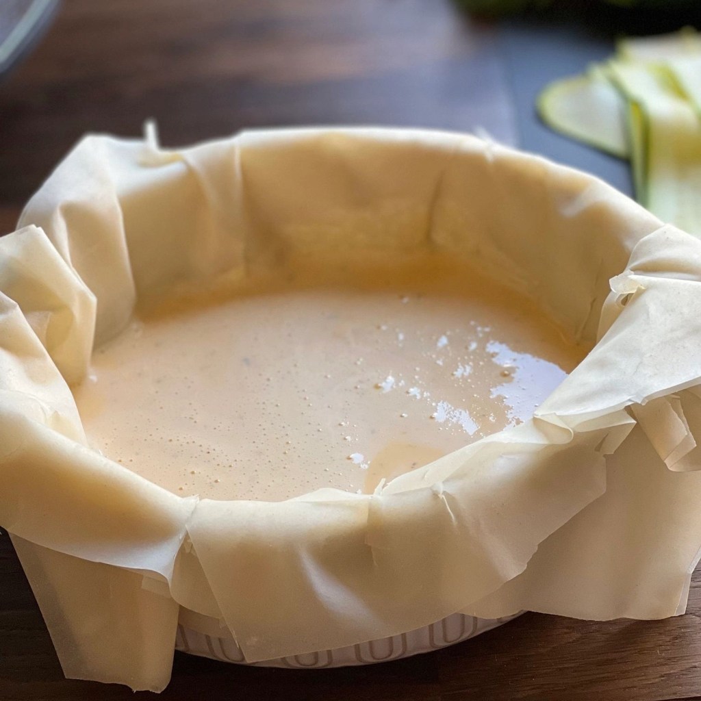 Die Zucchini und Karotten Scheiben abwechselnd als Strudel auf die Eiermischung setzen.