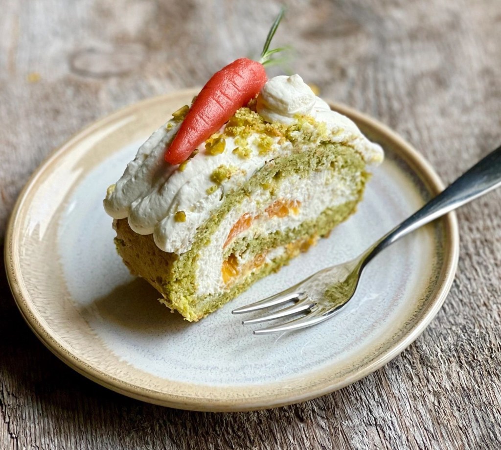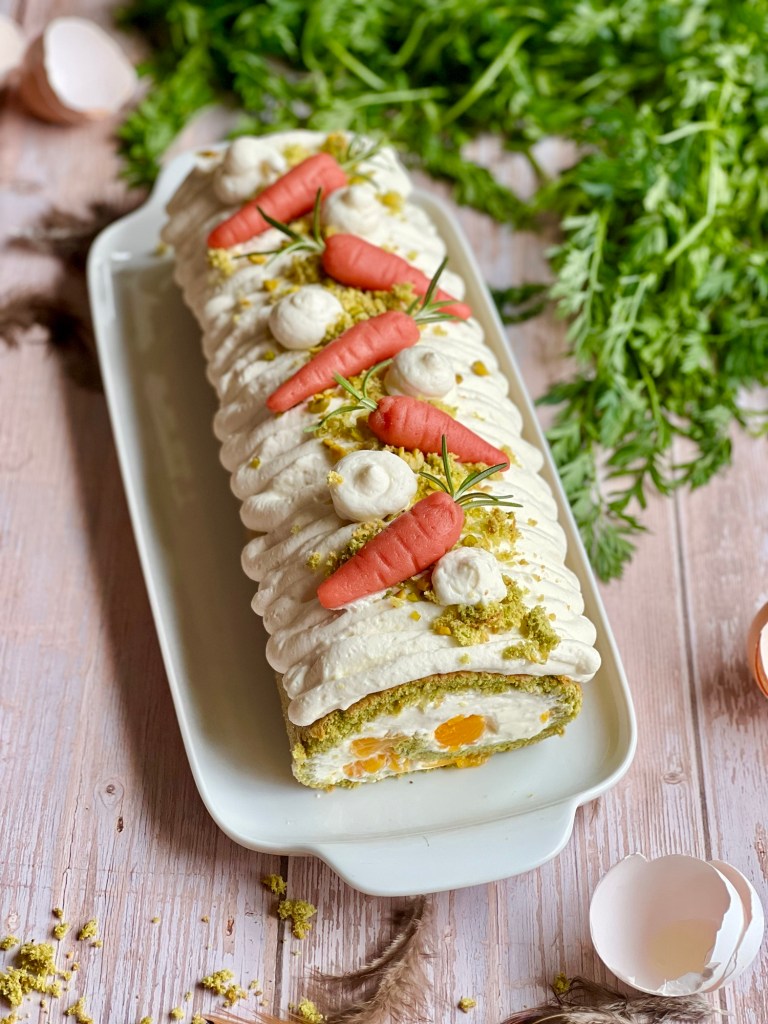 Die restliche Frischkäsemischung in einen Spritzbeutel füllen und wellig auf die Roulade spritzen. Die vorher abgeschnitten Enden zerbröseln und daraufstreuen. Mit Marzipan Karotten dekorieren.