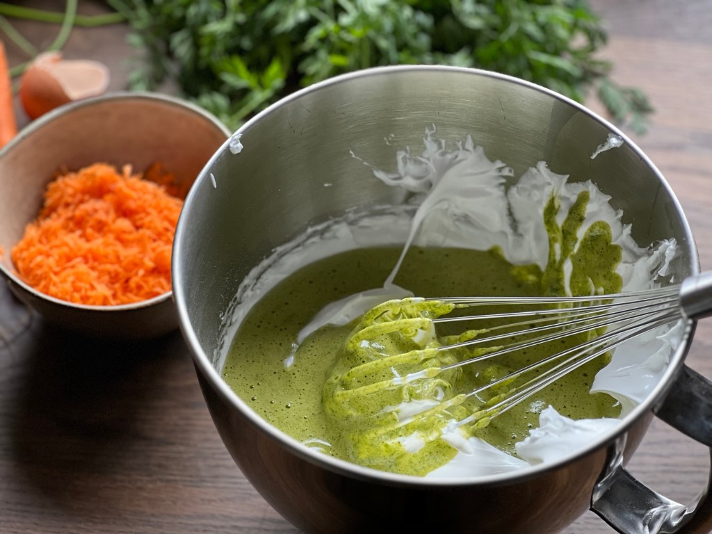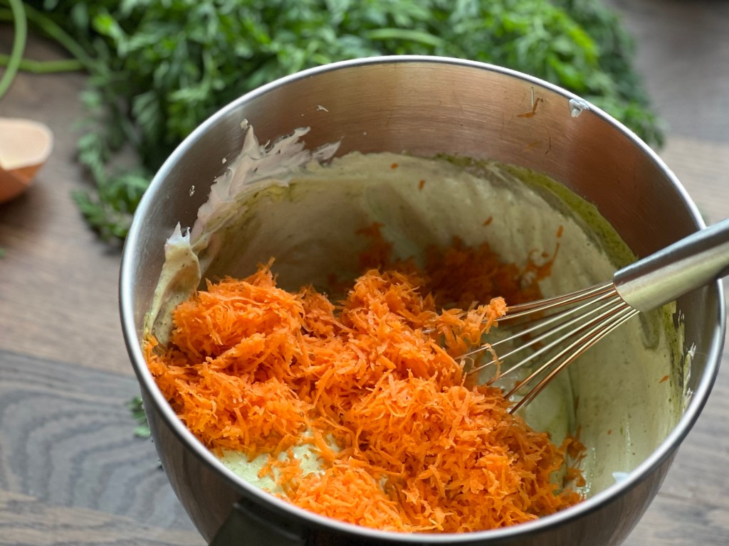 Die Mischung auf den Eischnee geben und vorsichtig unterheben. Danach die sehr fein geraspelten Karotten mit der Mehlmischung unterziehen.