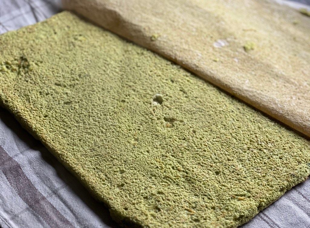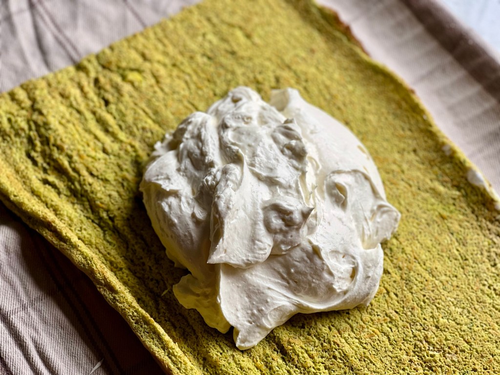 Abgekühlte Roulade aufrollen, die Enden etwas abschneiden und zur Seite legen. Die Hälfte der Frischkäsemischung darauf verstreichen.