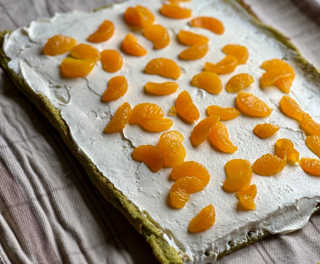 Die abgetropften Mandarinen darauf verteilen und vorsichtig von der langen Seite her aufrollen.