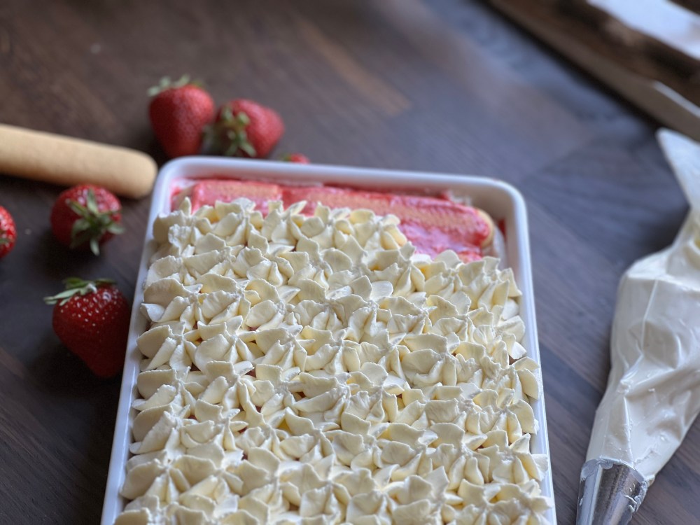 Die Löffelbiskuit in eine Auflaufform legen. Die Hälfte der pürierten Erdbeeren darüber geben.