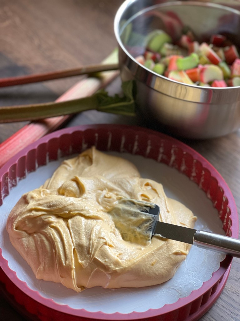 Rhabarberstücke auf den Teig legen und bei 180 Grad Ober-/Unterhitze im vorgeheizten Ofen 40 Minuten backen.