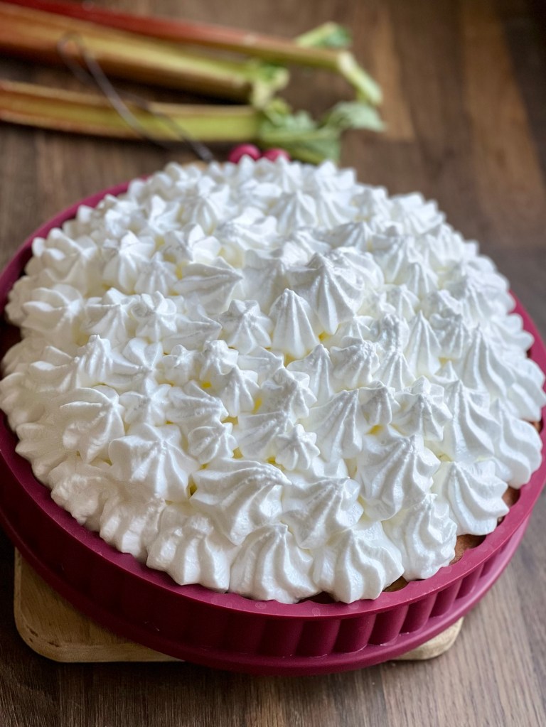Kuchen aus dem Ofen nehmen und die Baisermasse daraufspritzen. Man kann die Masse natürlich auch einfach daraufstreichen.