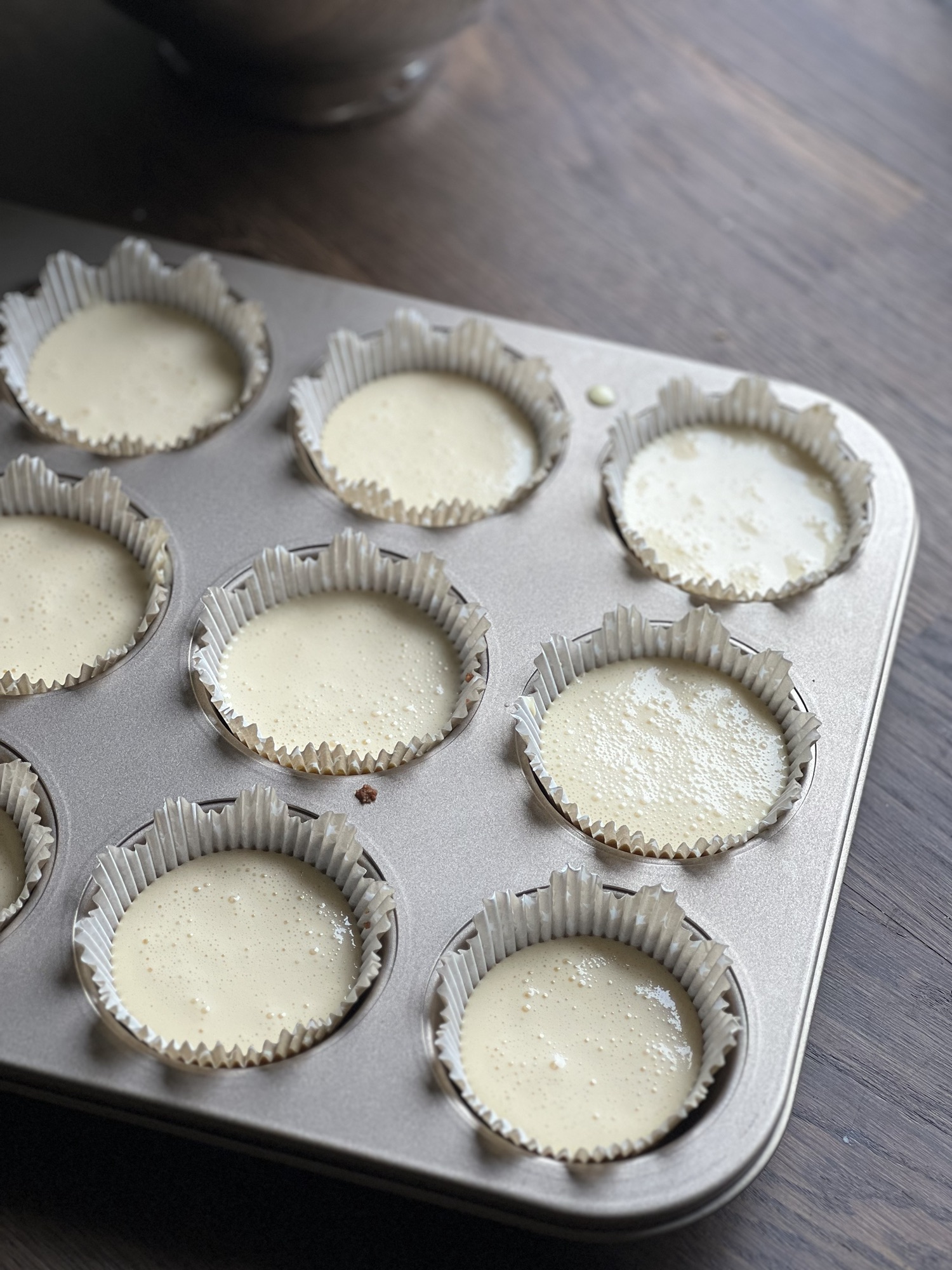 Papierförmchen in das Muffinblech stecken, die Bröselmischung auf die Förmchen verteilen und gut mit einem Löffel auf den Boden andrücken.