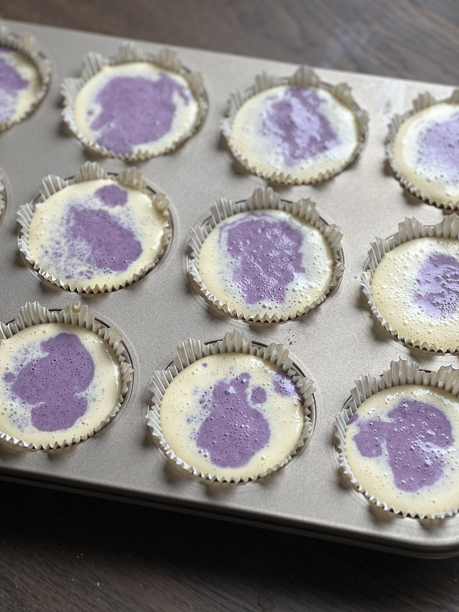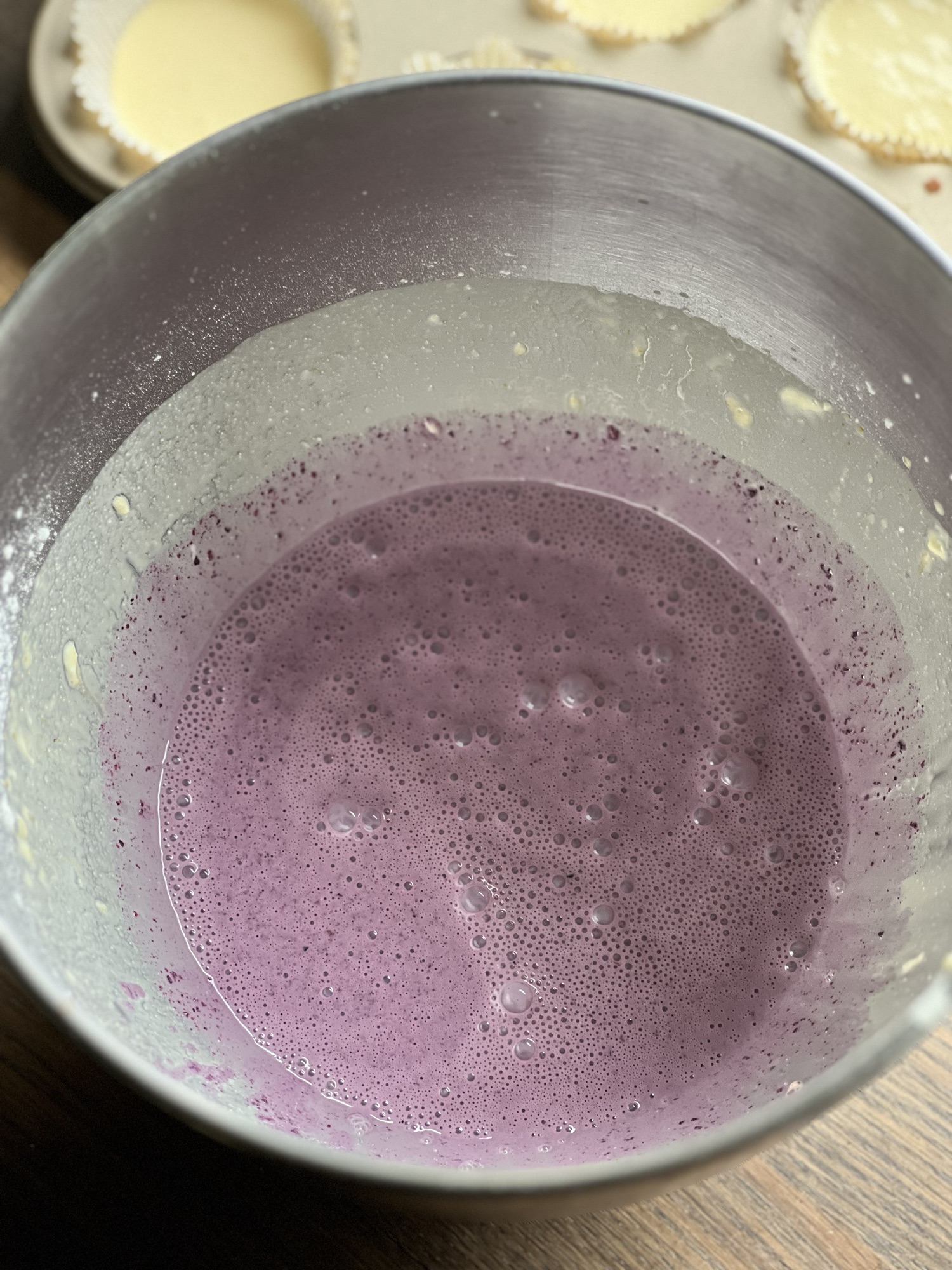 Die gefrorenen Blaubeeren leicht erwärmen und pürieren. Mit 1 EL Speisestärke unter die restliche Frischkäsecreme rühren und auf der hellen Creme verteilen.