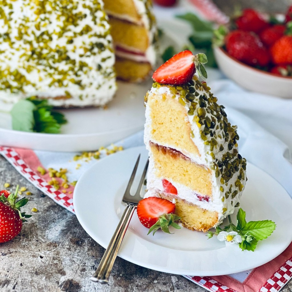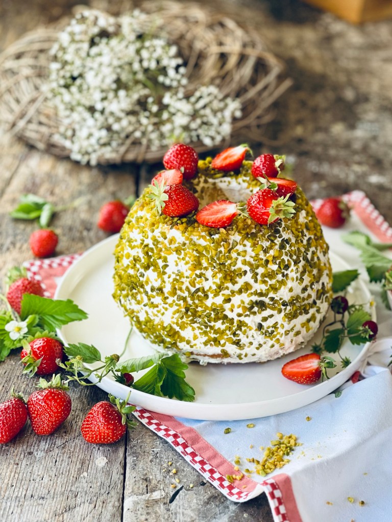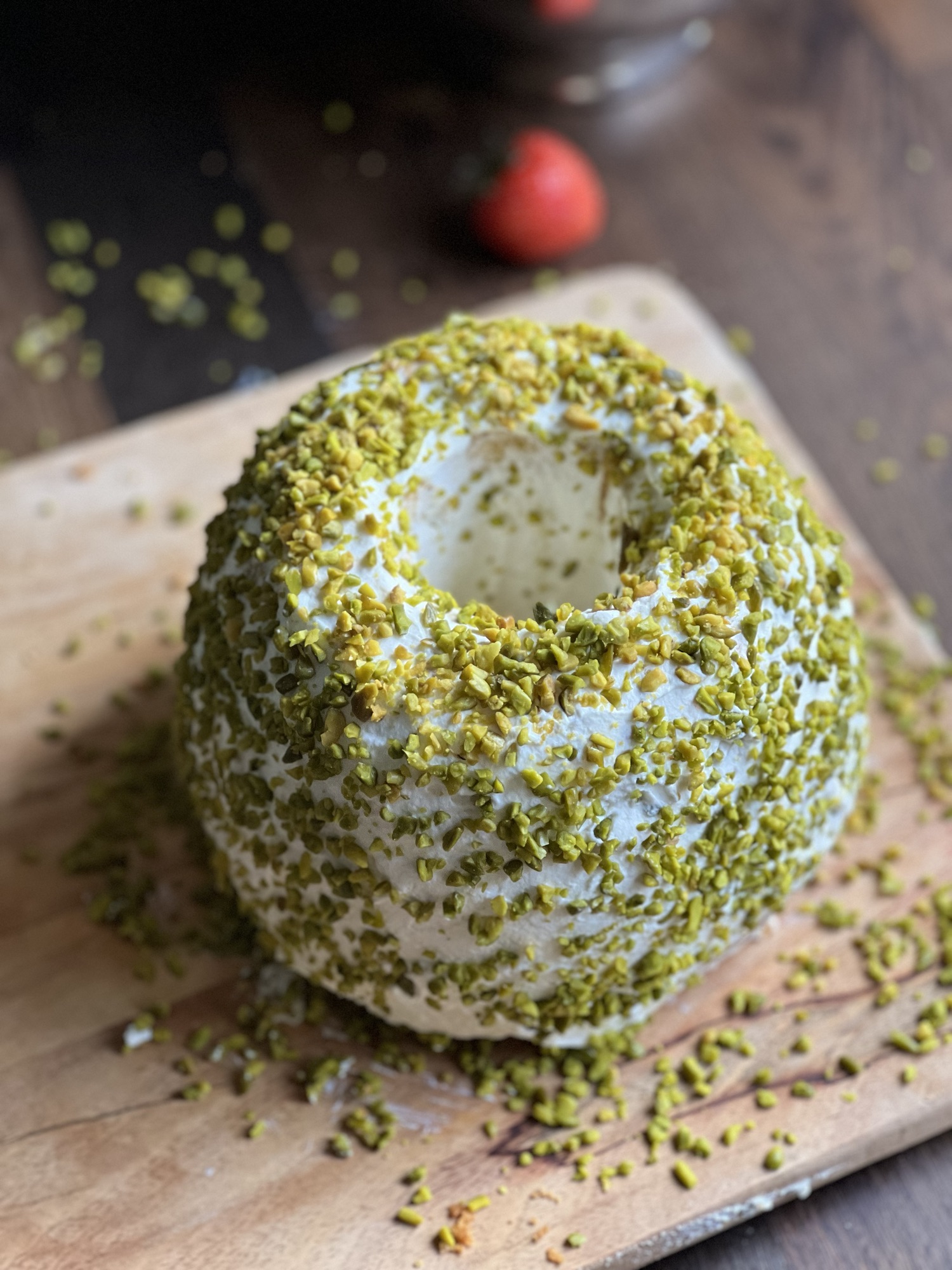 Den Gugelhupf ringsum mit Sahnecreme bestreichen und die gehackten Pistazien daraufstreuen.