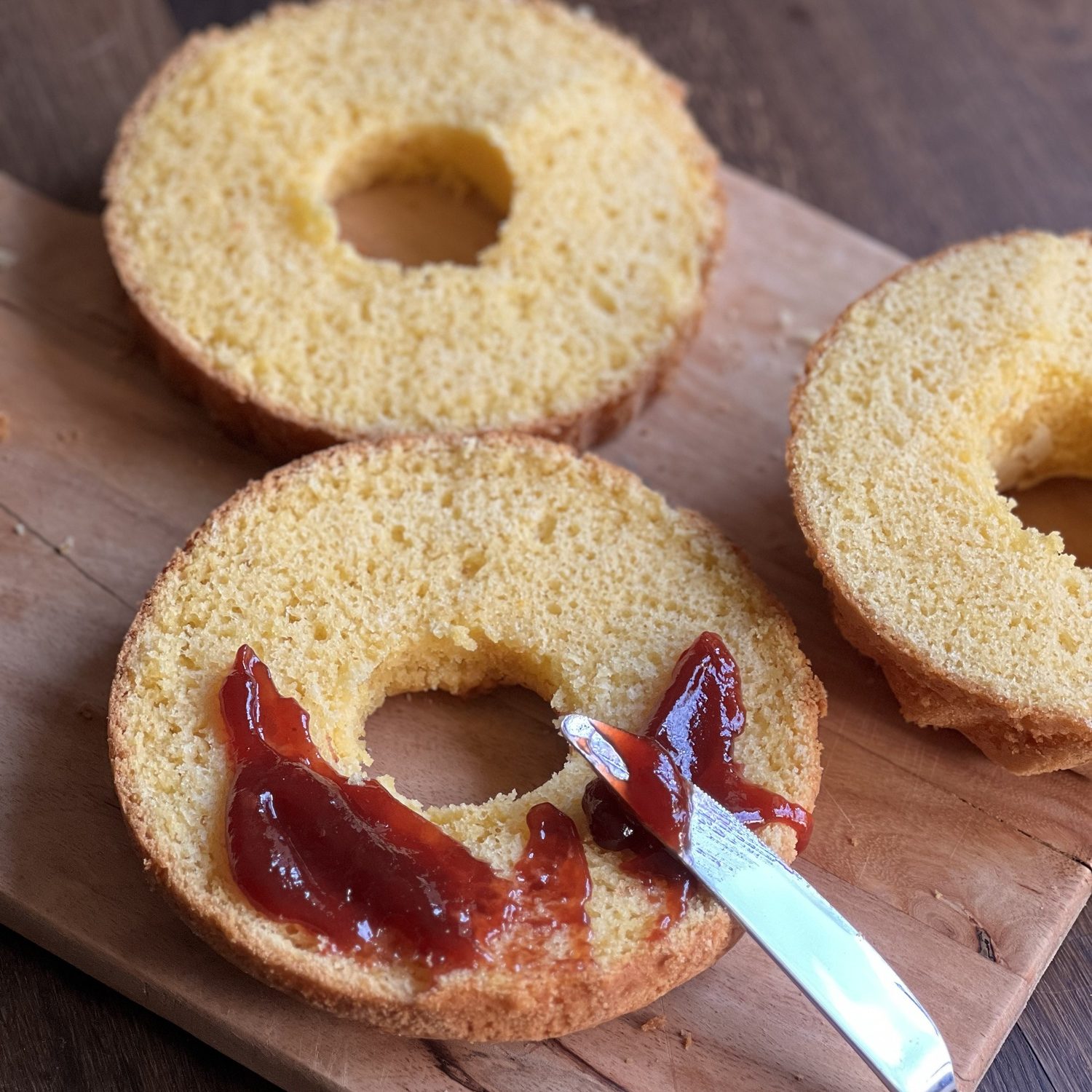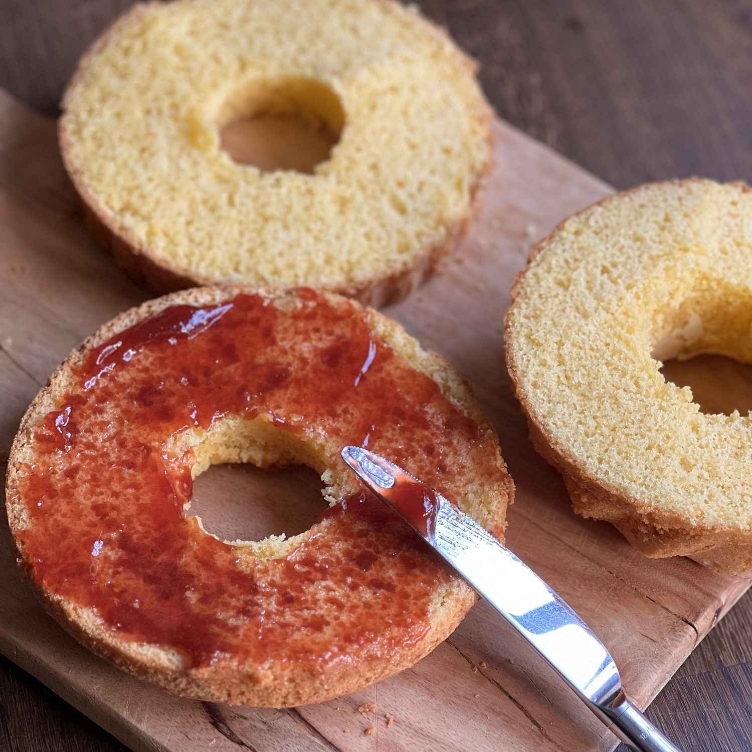 Auf den unteren Teil erst 2 EL Marmelade streichen, darauf etwas Sahnecreme verteilen.