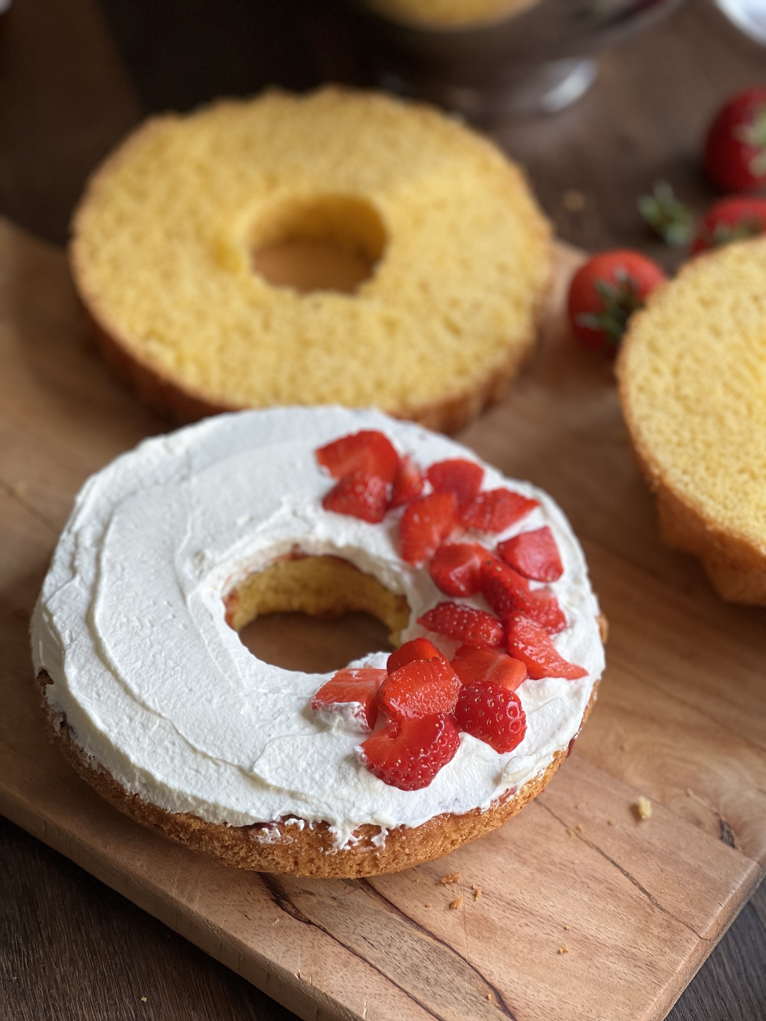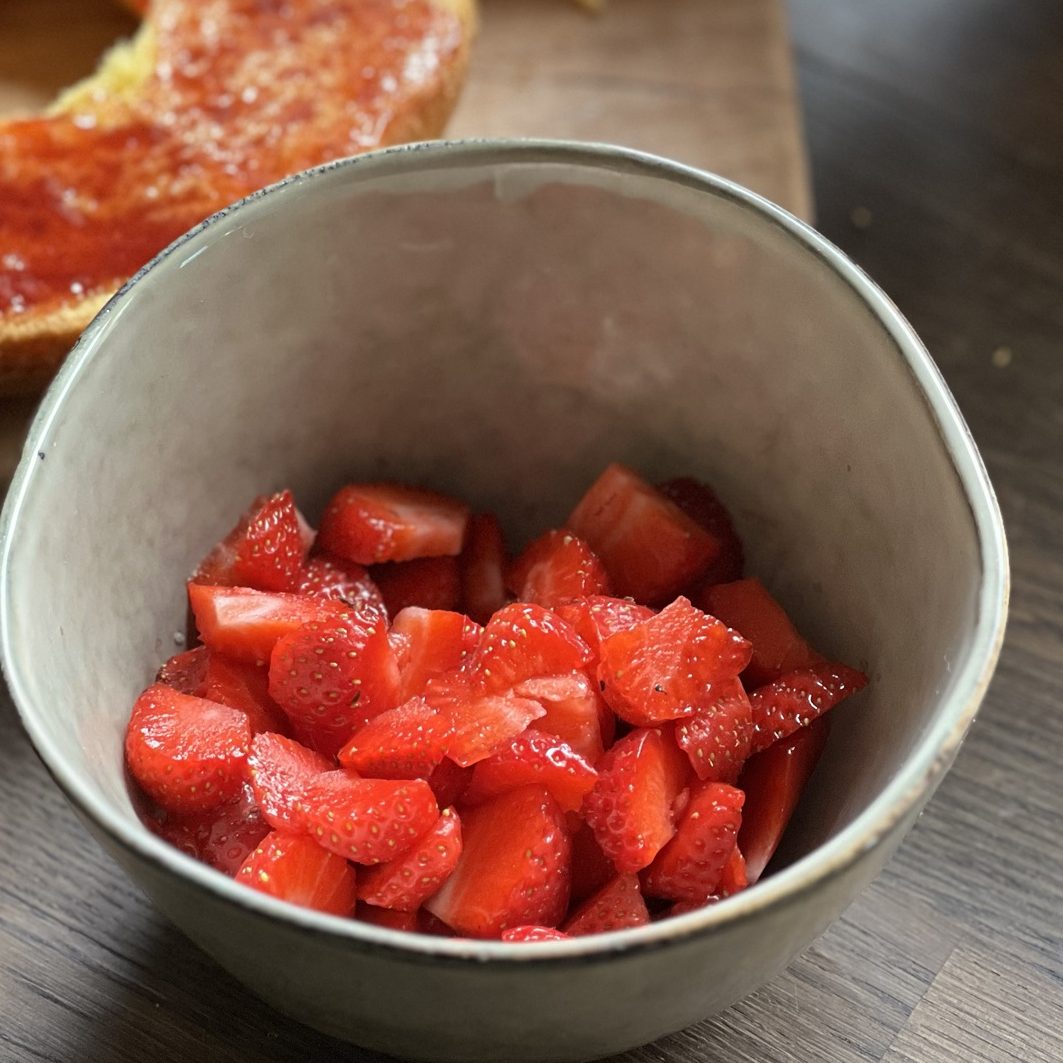 Nun die geschnittenen Erdbeeren darauf geben und nochmals Sahnecreme darüberstreichen.