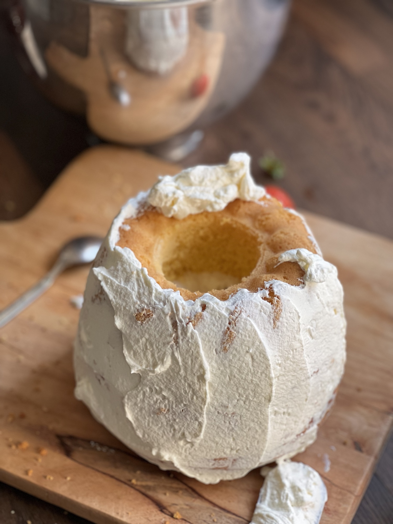 Ausgekühlten Gugelhupf aus der Form stürzen, waagerecht zweimal durchschneiden.