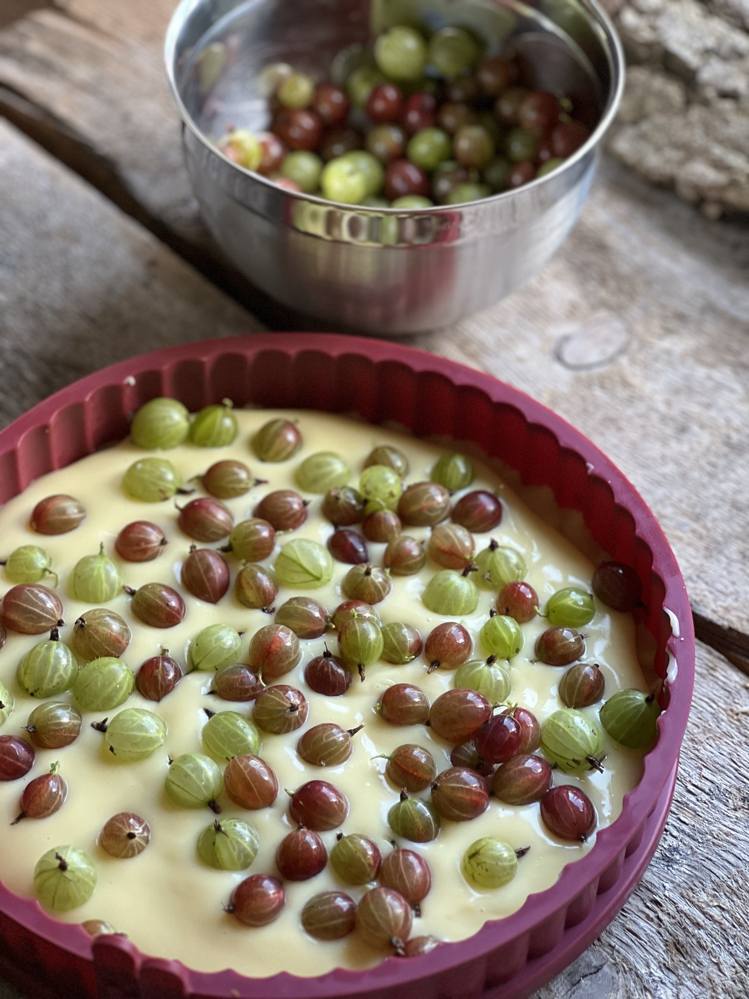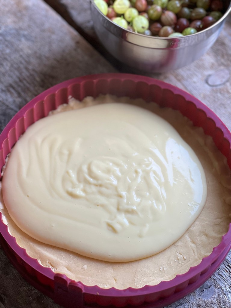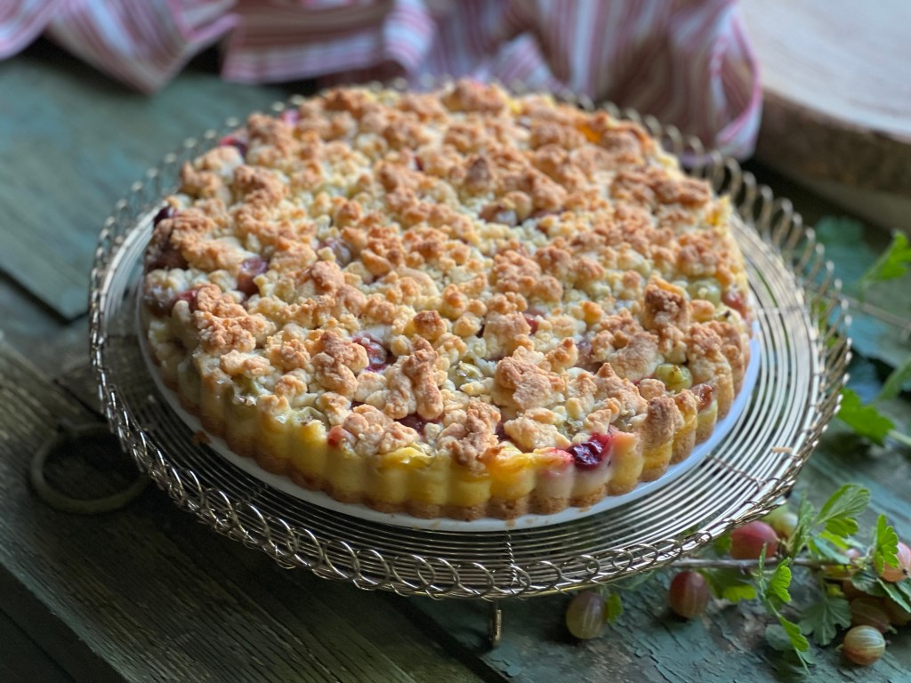 Die Stachelbeeren gleichmäßig auf die Puddingschicht legen und den restlichen Streuselteig darüber verteilen.