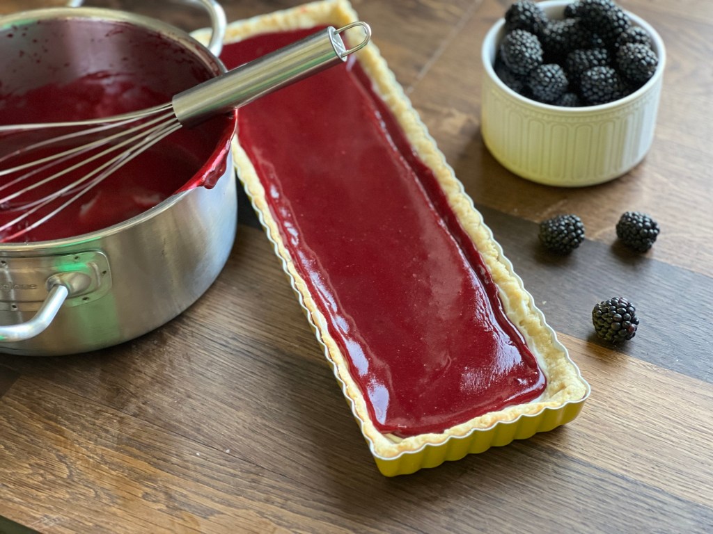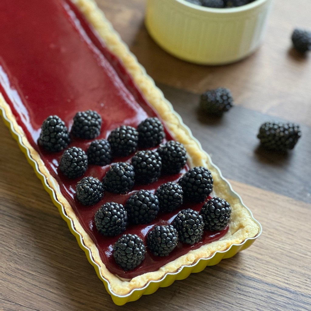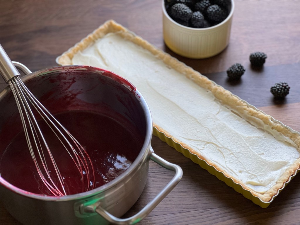 Ein süßer Mürbeteig bietet das perfekte Bett für Frischkäsecreme, Fruchtpüree und leckere Brombeeren.