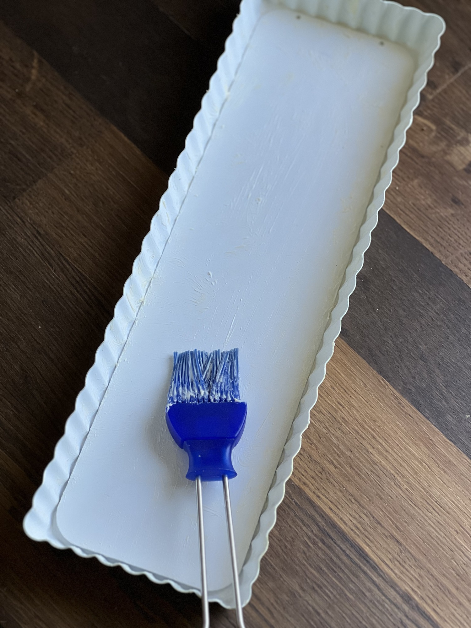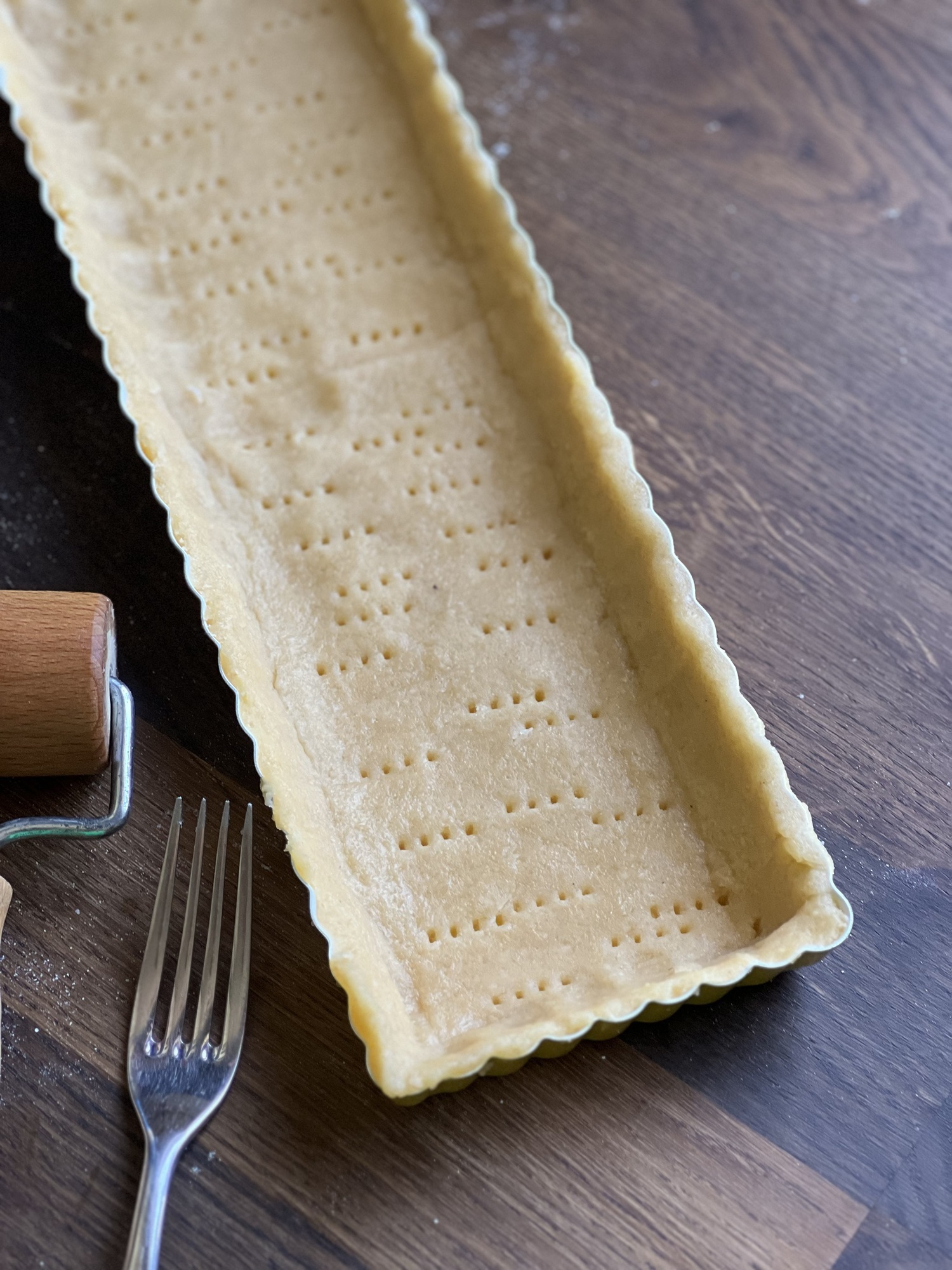 Den Ofen auf 160 °C Ober-Unterhitze vorheizen. Die Tarteform fetten. Den Mürbeteig auf einer bemehlten Arbeitsfläche ausrollen und die Tarteform damit auslegen.