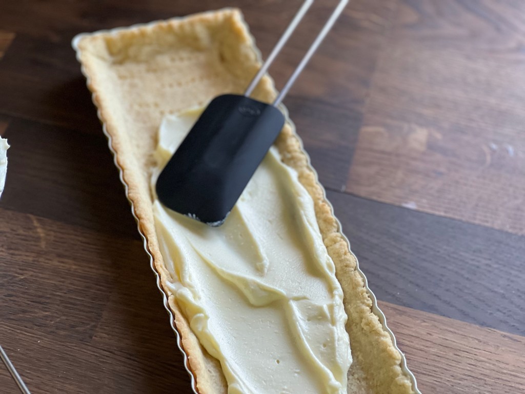 Die weiße Kuvertüre schmelzen. Mit Frischkäse verrühren und auf den Tarteboden streichen.