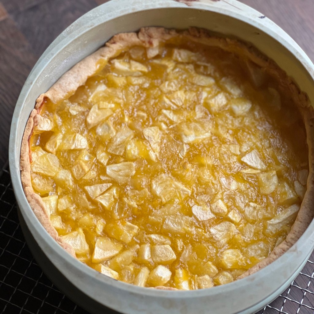 Den Boden mehrmals einstechen. Äpfel darauf geben. Bei 180° Ober- Unterhitze ca. 55 Minuten backen. Auskühlen lassen.