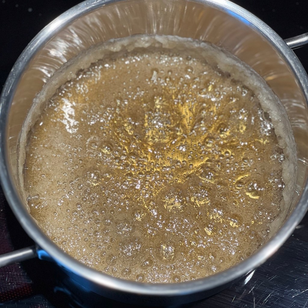 Für die Karamellsauce 150 g Zucker und fünf Esslöffel Wasser in einem Topf zum Kochen bringen. So lange köcheln, bis er eine goldbraune Farbe angenommen hat.