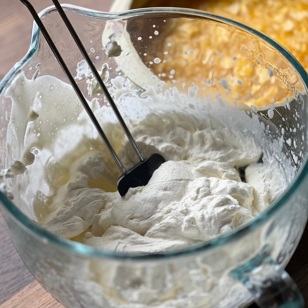 Schmand und Sahne steif schlagen, zwei Päckchen Vanillezucker einrichten lassen.