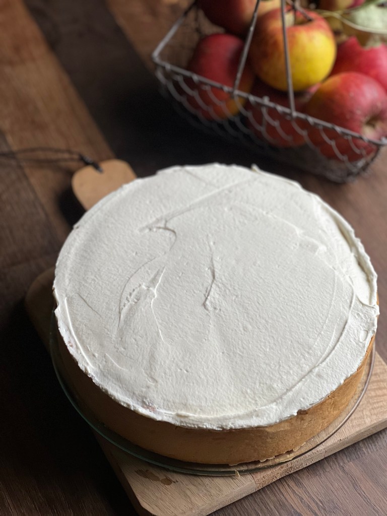 Die Creme auf den abgekühlten Apfelkuchen streichen und circa 30 Minuten kühlen.