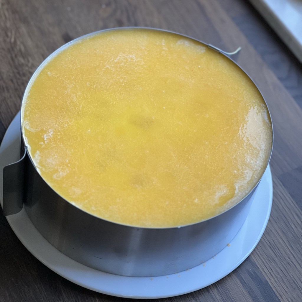 Für den Guss 3 Pfirsiche pürieren. Gelatine einweichen. Maracujasaft erwärmen und Gelatine darin auflösen. Die pürierten Pfirsiche dazugeben, verrühren und über die Sahnecreme gießen.