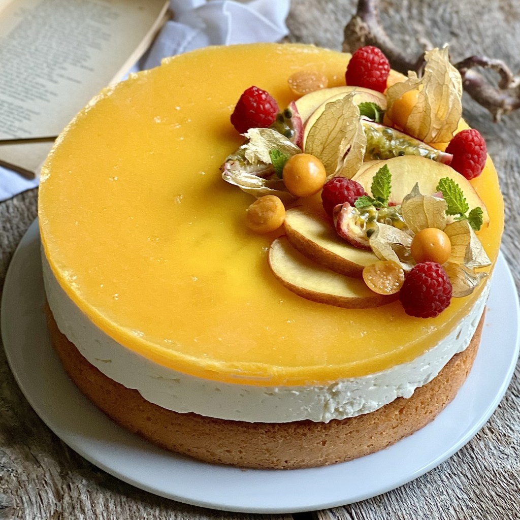 Nochmals 30 Minuten kaltstellen. Mit Maracuja, Pfirsich, Himbeeren und Physalis dekorieren.