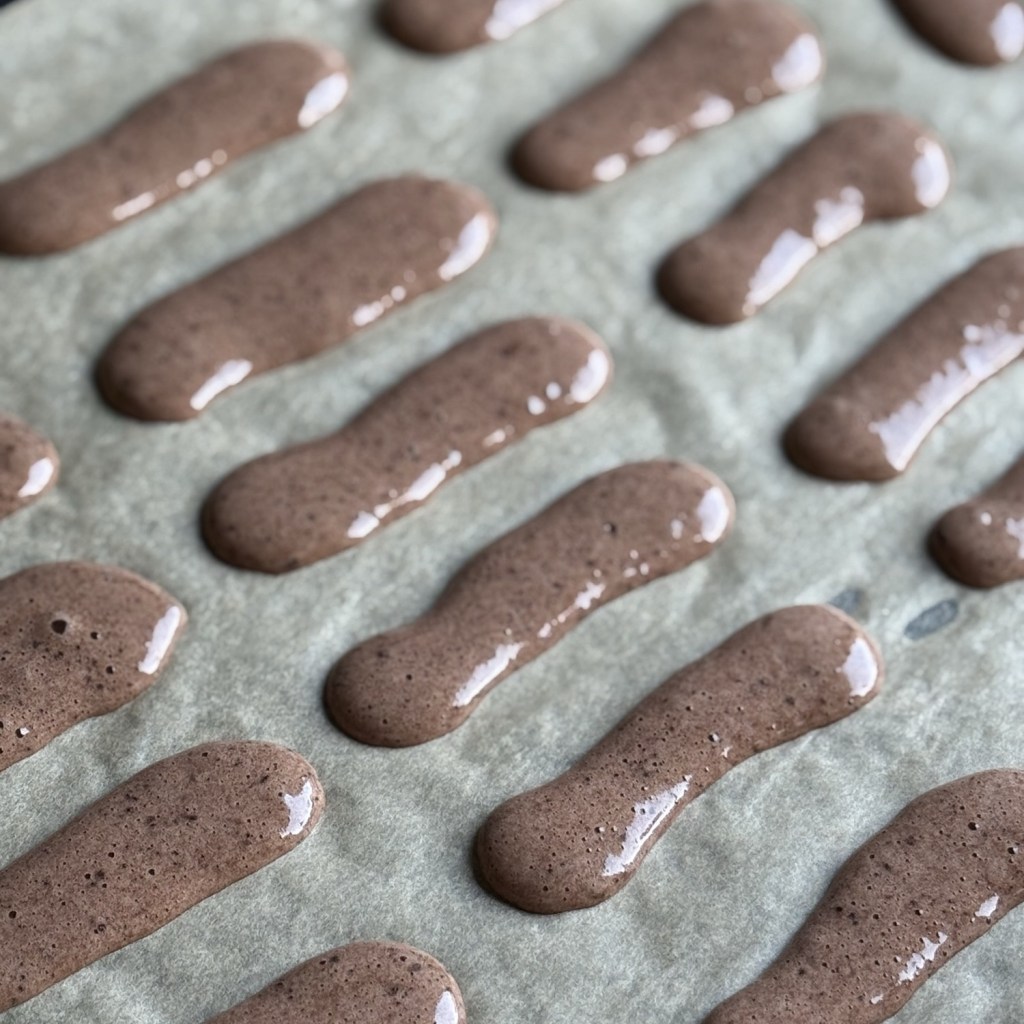 Teig in einen Spritzbeutel mit Lochtülle füllen. Ein Backblech mit Backpapier auslegen und längliche Löffelbiskuits darauf spritzen.