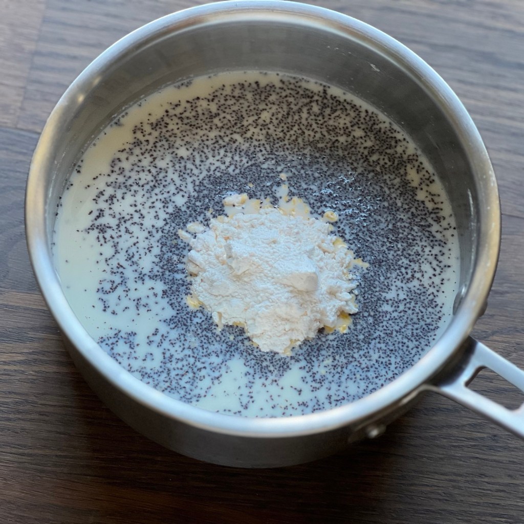Milch, 1 Pck. Vanillepuddingpulver, Mohn und 70 g Zucker verrühren und in einem Topf kurz aufkochen.