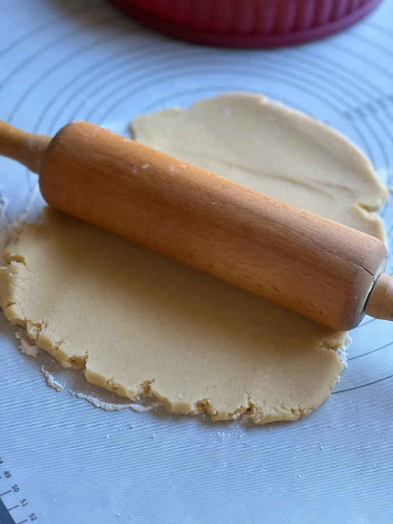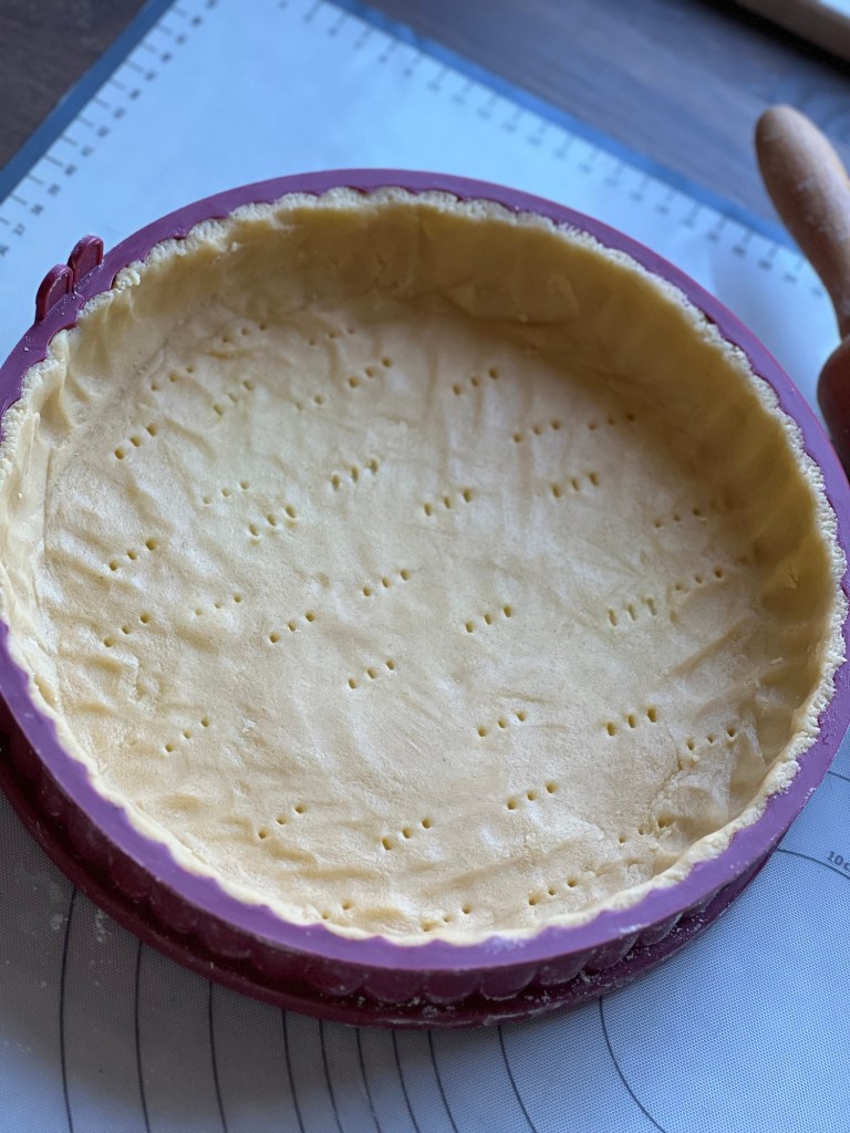 Das Eigelb mit Mehl, 125 g Zucker, Vanillezucker, Salz und Butter verkneten. Den Teig ausrollen und in eine gefettete Backform legen, Am Rand und Boden andrücken und mit einer Gabel in den Teig stechen. Das ganze 40 Min. kaltstellen.